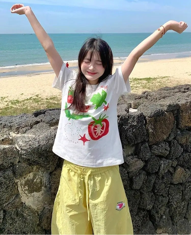 Lunivop T Shirts Women Sweet Cartoon Fruit Printed Short Sleeve O Neck Summer Fashion Loose Y2k Tops Female Casual Tshirt