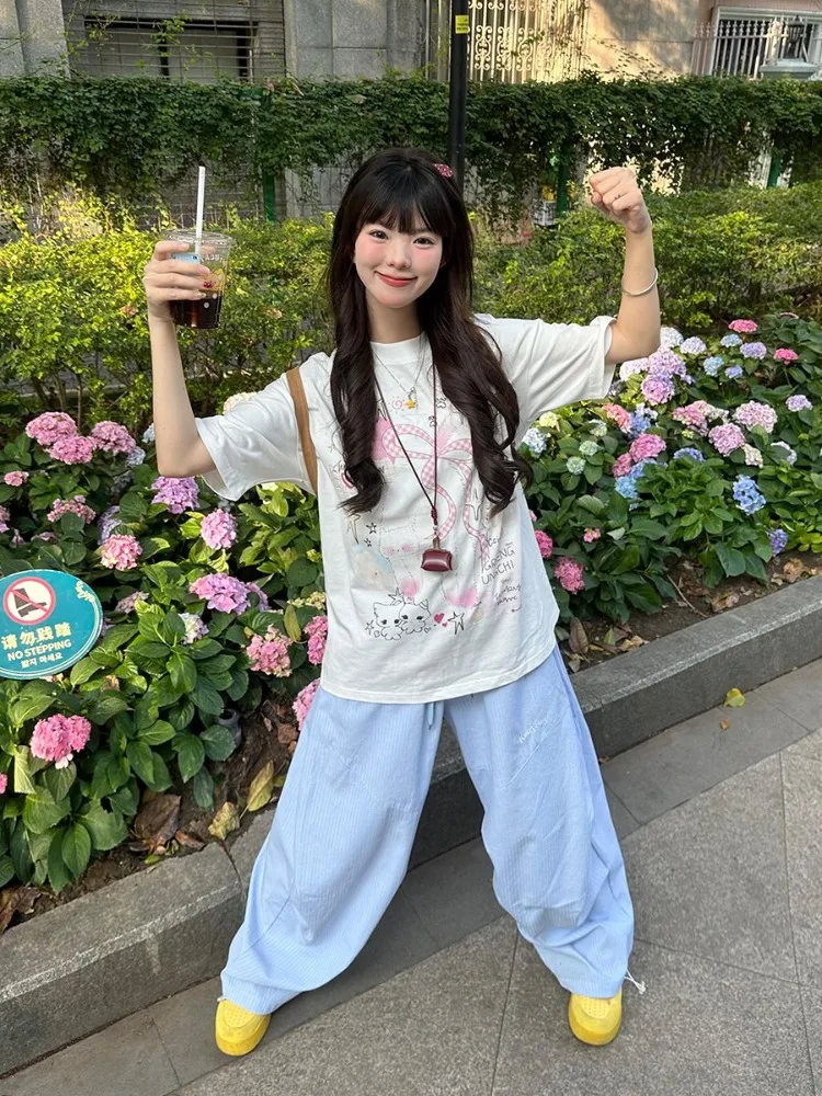 Lunivop T Shirts Women Vintage Short Sleeve Loose Cartoon Printed O Neck Sweet Funny Tops Female Casual Tshirt Summer