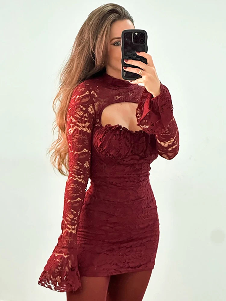 Lunivop Turtleneck Sexy Hollow Out Lace Women Dress Black Flare Sleeve A-line Dress Femme Spring Skinny Elegant Party Club Dress