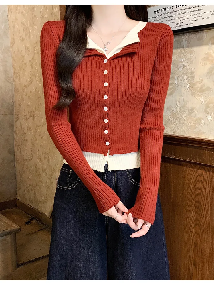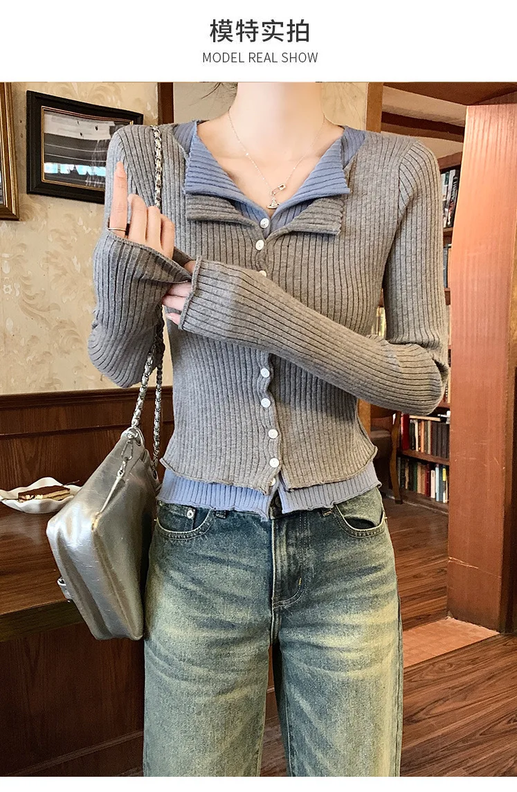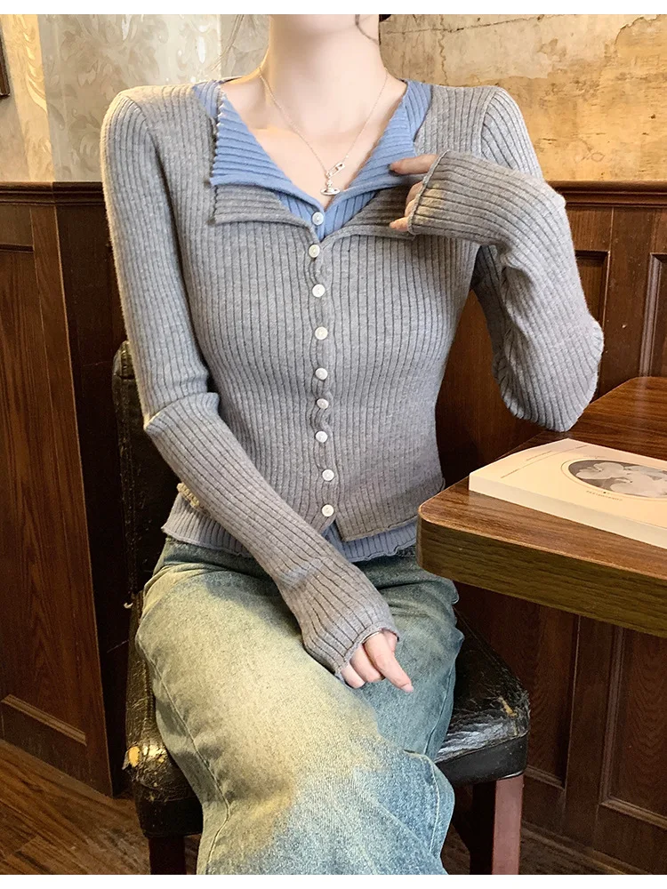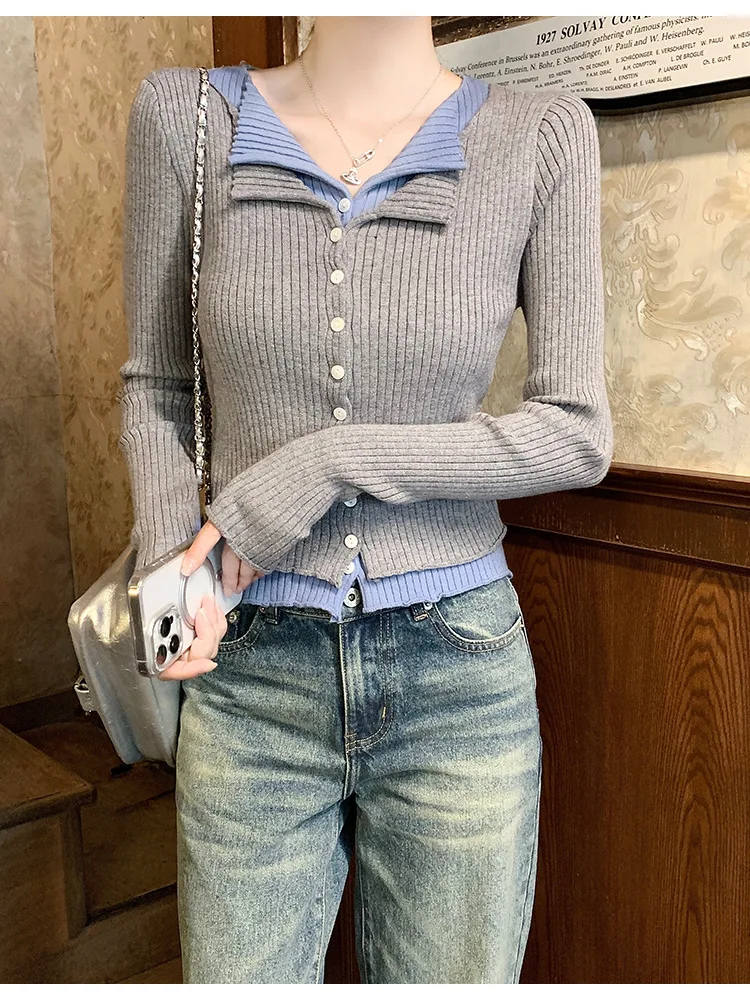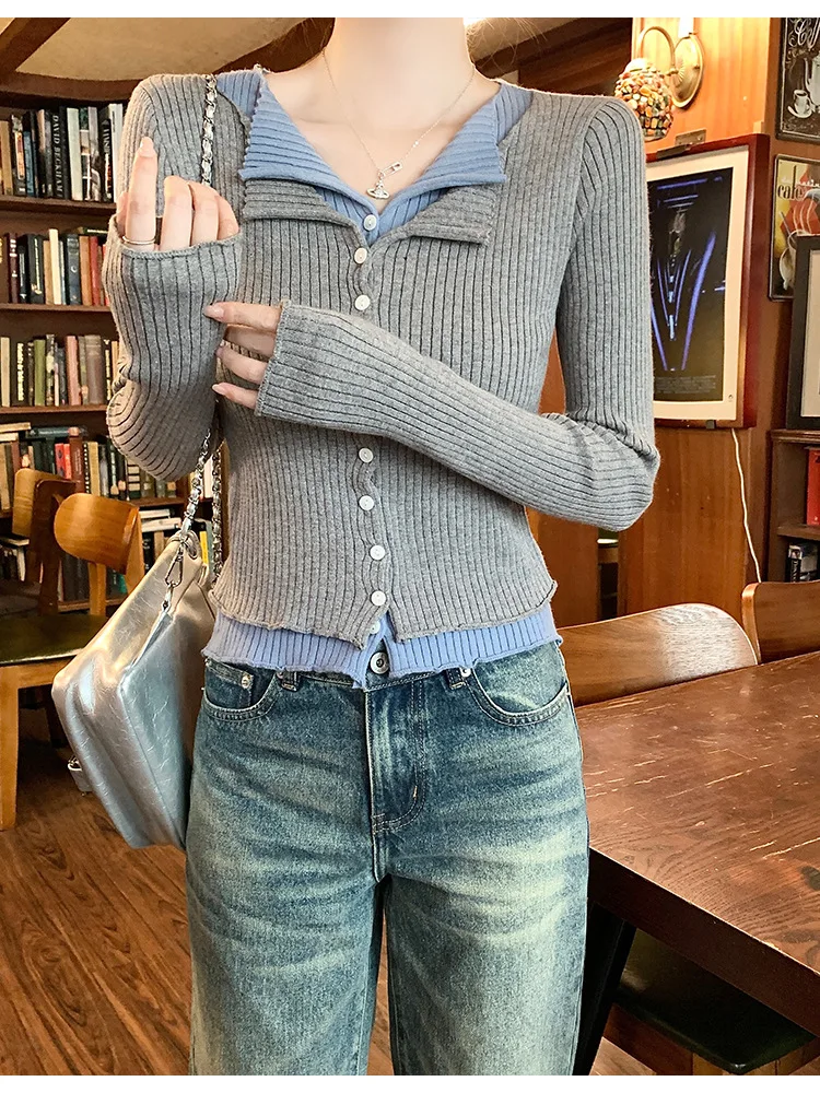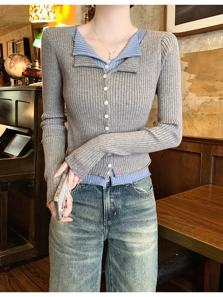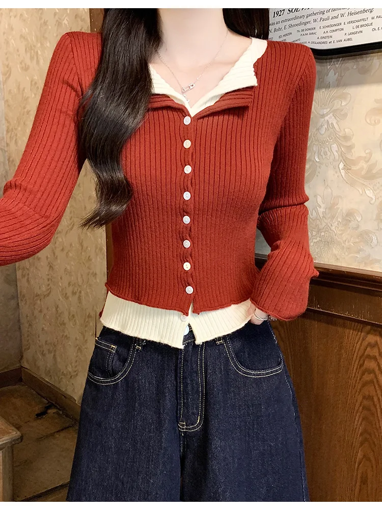 Lunivop V-neck Fake Two Long-sleeved Short Slim Early Autumn Sweaters with Bottoming Shirts in 2025