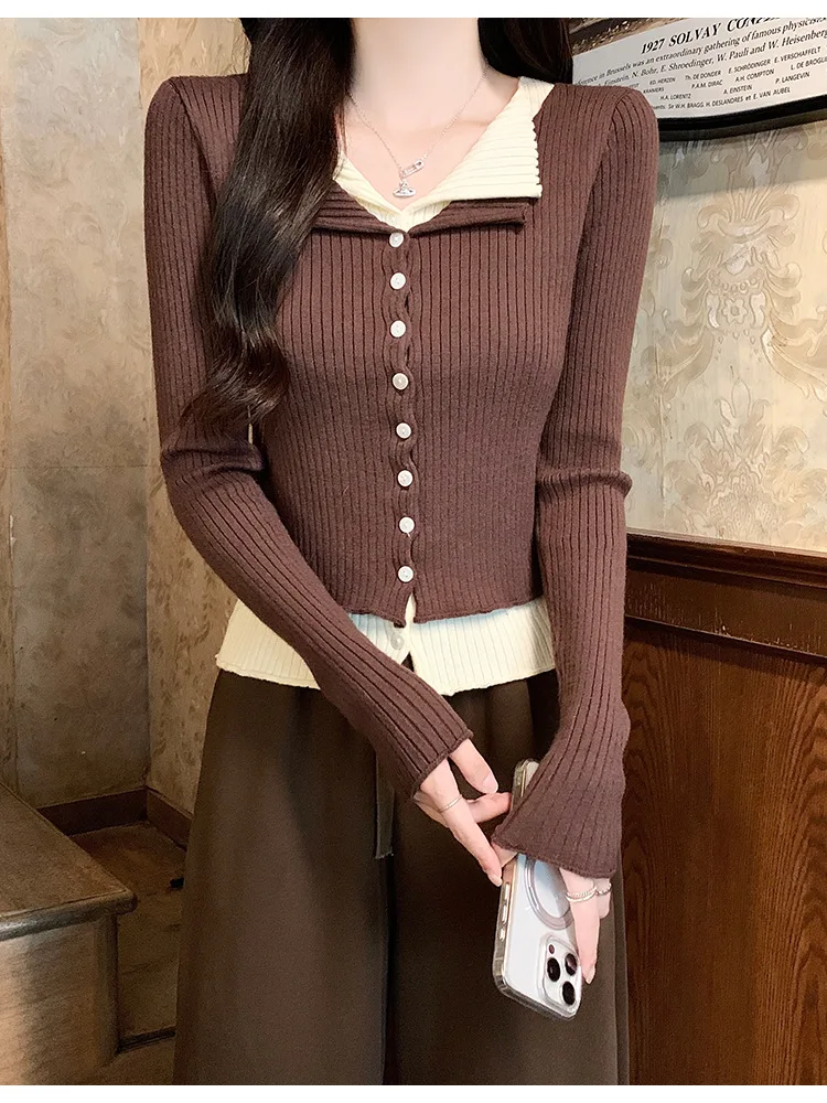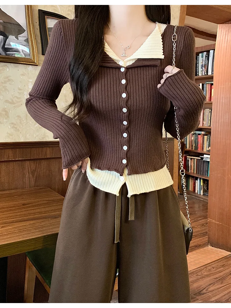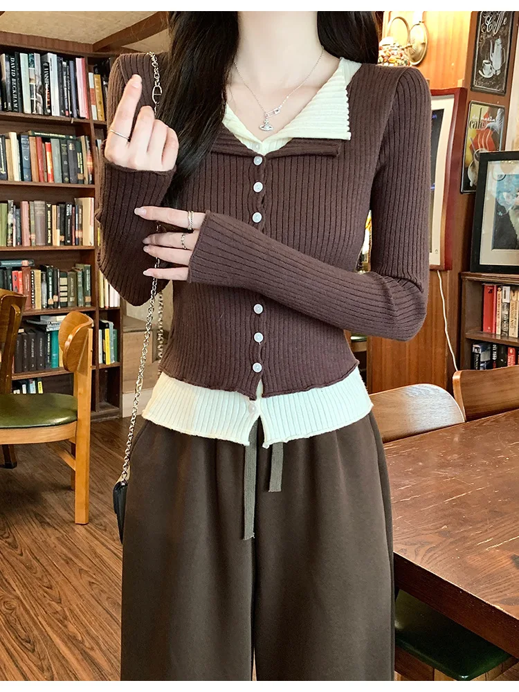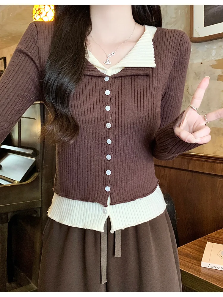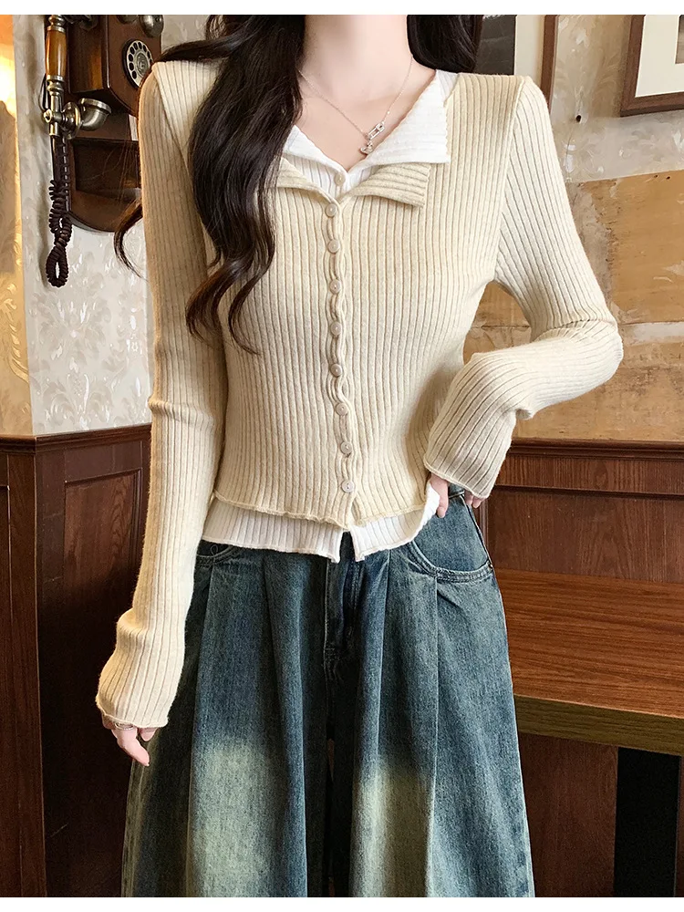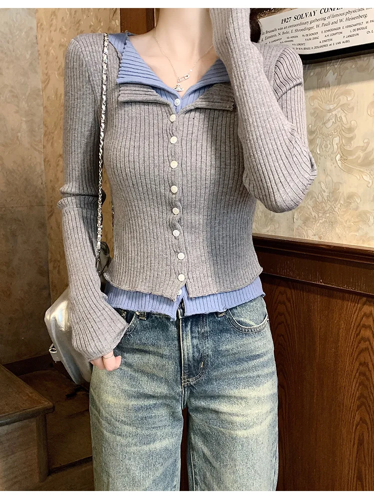 Lunivop V-neck Fake Two Long-sleeved Short Slim Early Autumn Sweaters with Bottoming Shirts in 2025