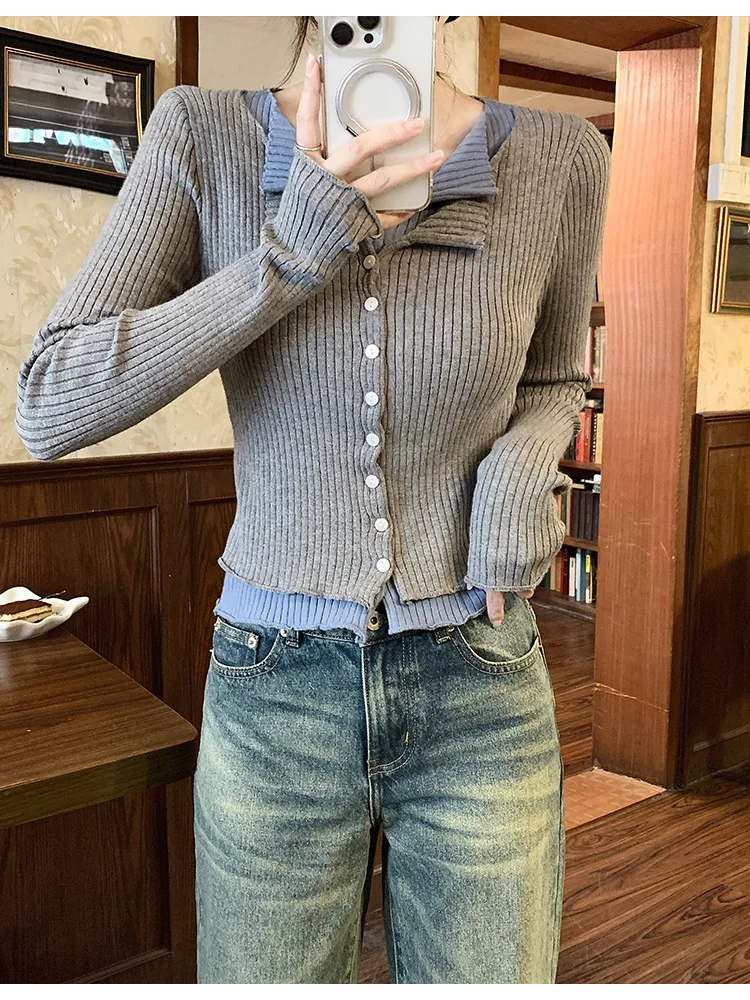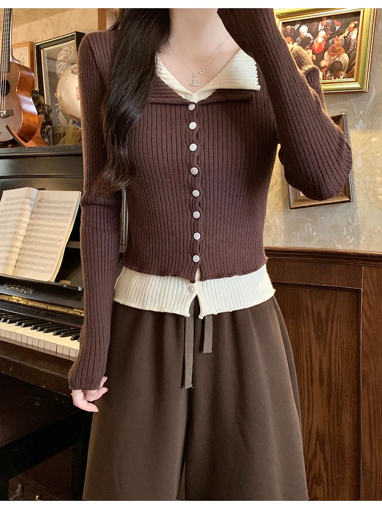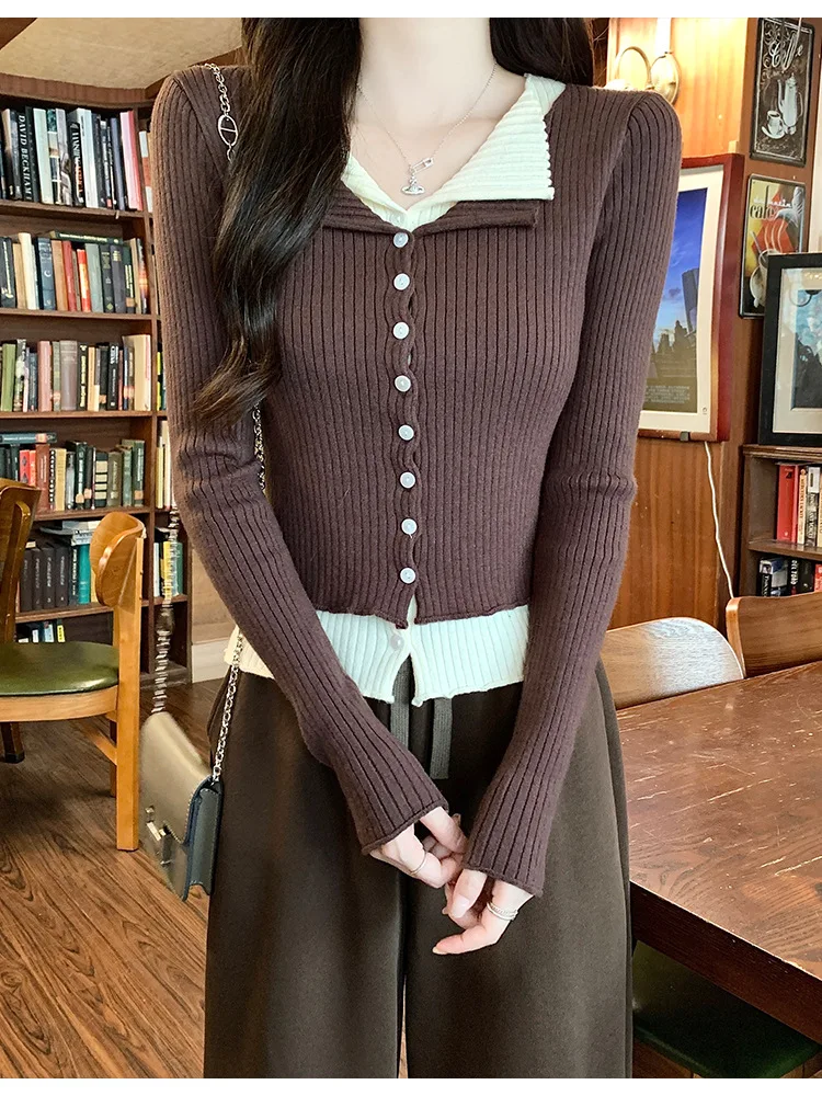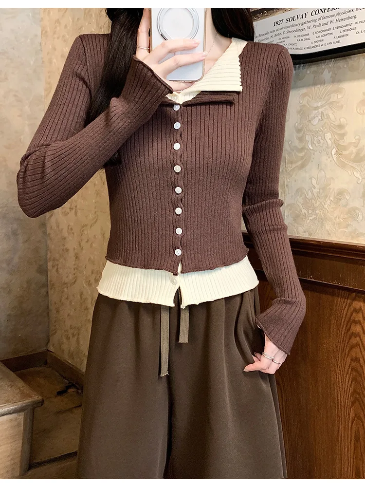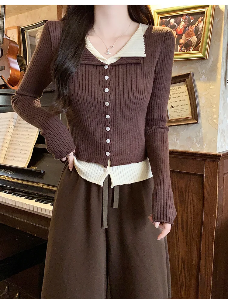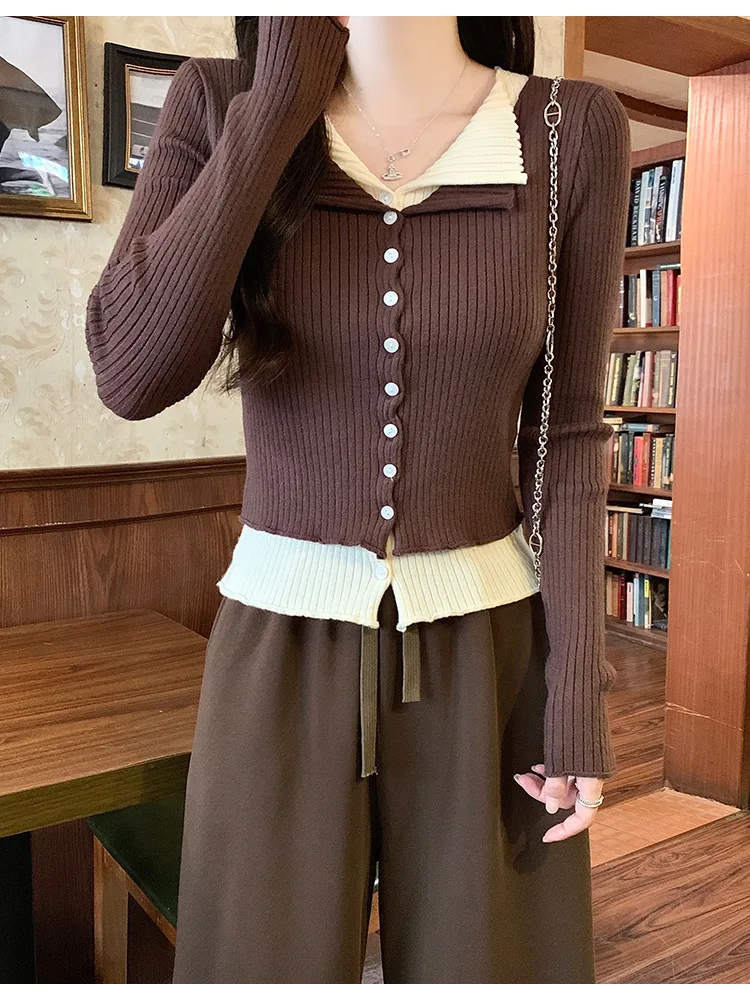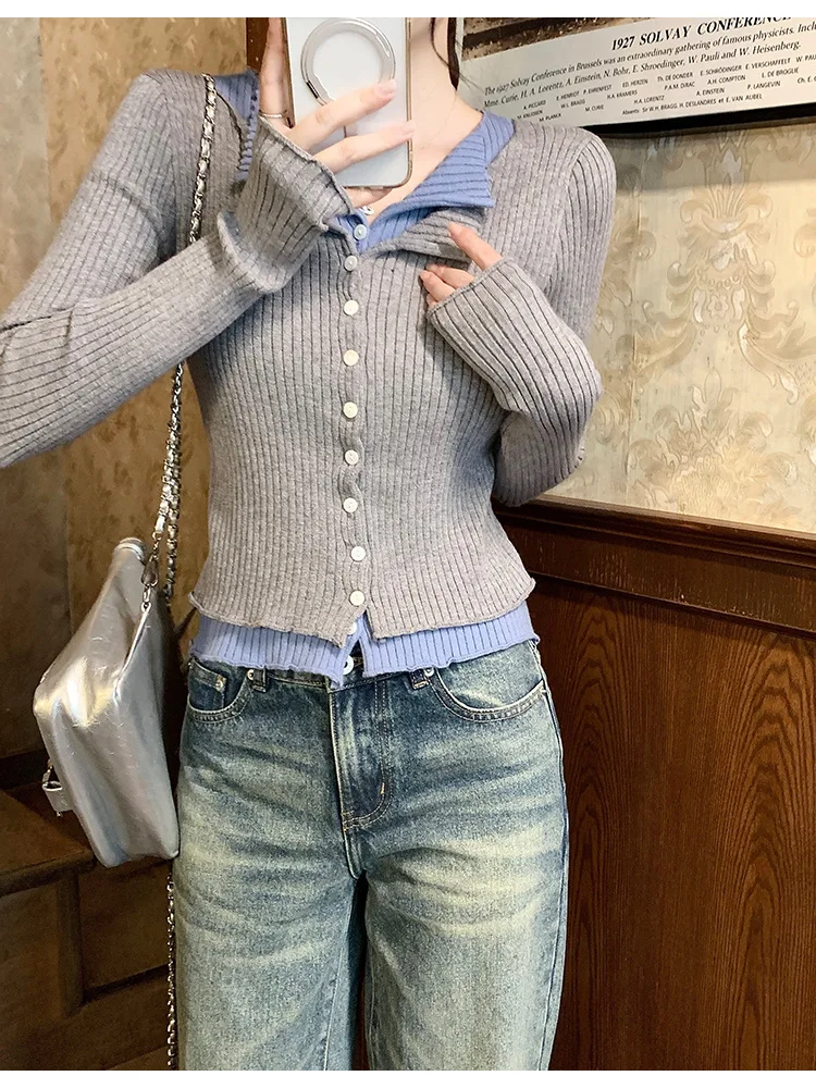 Lunivop V-neck Fake Two Long-sleeved Short Slim Early Autumn Sweaters with Bottoming Shirts in 2025