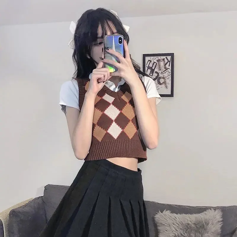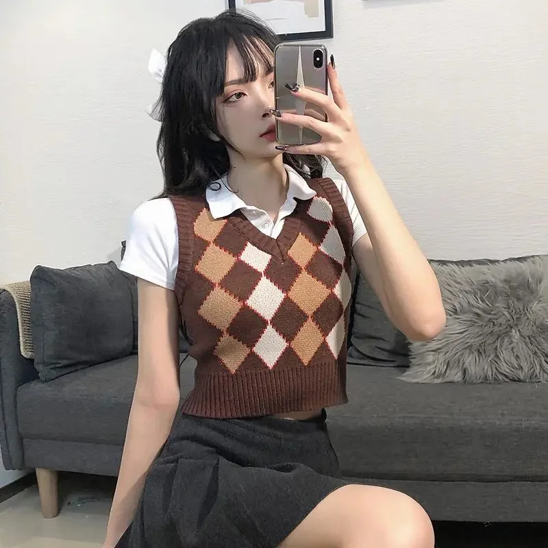 Lunivop Vintage Argyle Knitted Sweater Vest Women Preppy Style V Neck Sleeveless Crop Sweaters Haut Femme