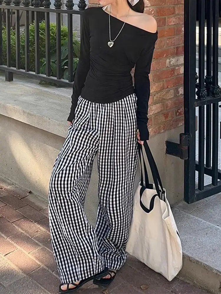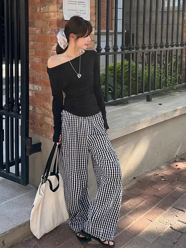 Lunivop Vintage Baggy Plaid Pants Woman Y2k Casual Sports Korean Fashion Wide Leg Trousers Jogging Harajuku High Waist Pantalones