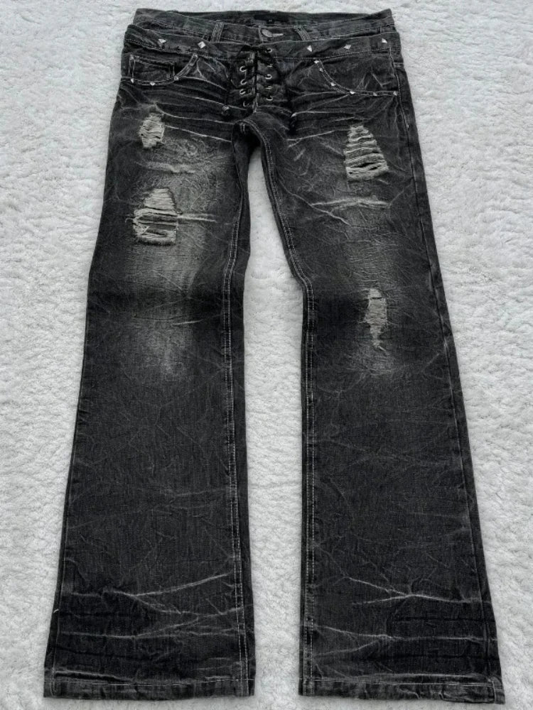 Lunivop Vintage Double Waisted Lace Up Micro Women Flared Jeans Y2K Washed Wide Leg American Style Denim Pants Baggy Streetwear