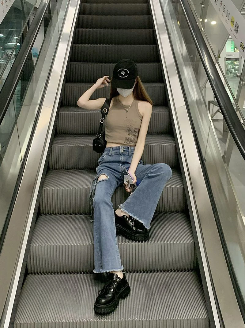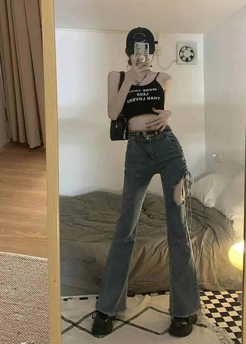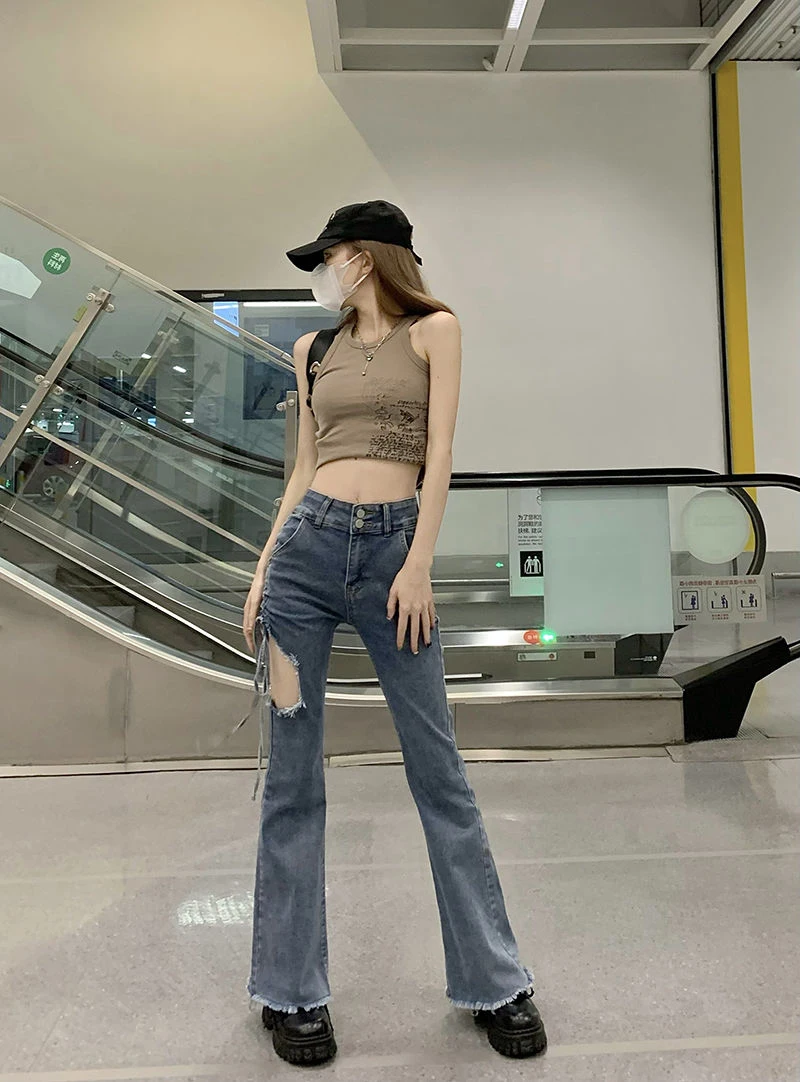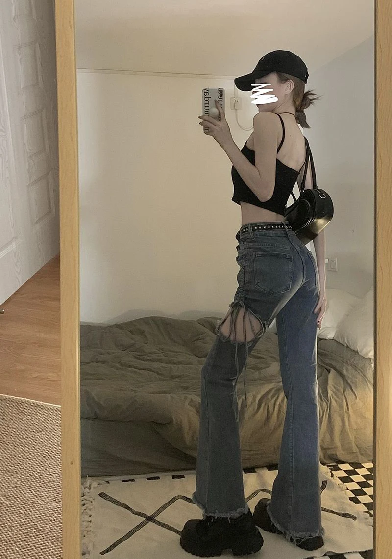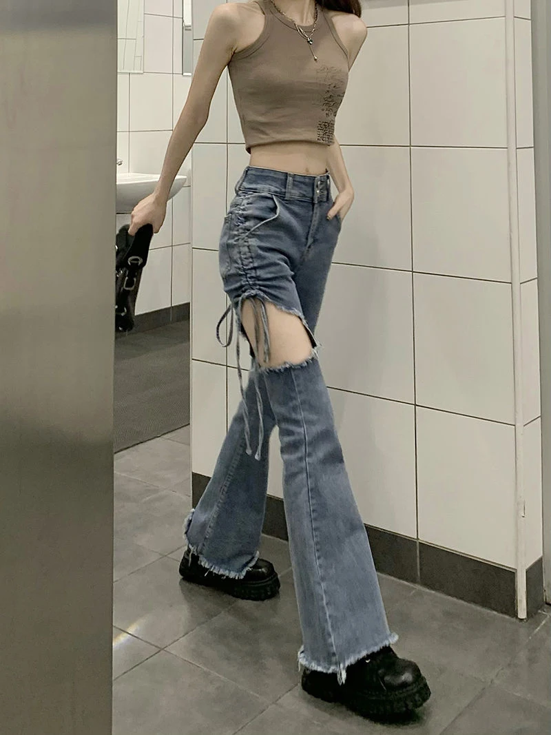 Lunivop Vintage Flare Jeans Women Y2K Sexy High Waist Hollow Out Shirring Denim Trousers Korean Fashion Elastic Slim Pants New