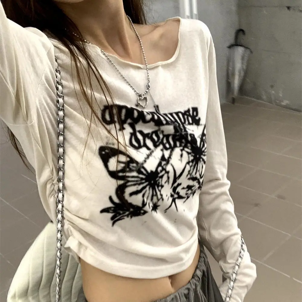 Lunivop Vintage Grunge Y2k Cropped Tshirt for Women Graphic Print Kpop Long Sleeve Summer Tees Coquette Aesthetic Harajuku