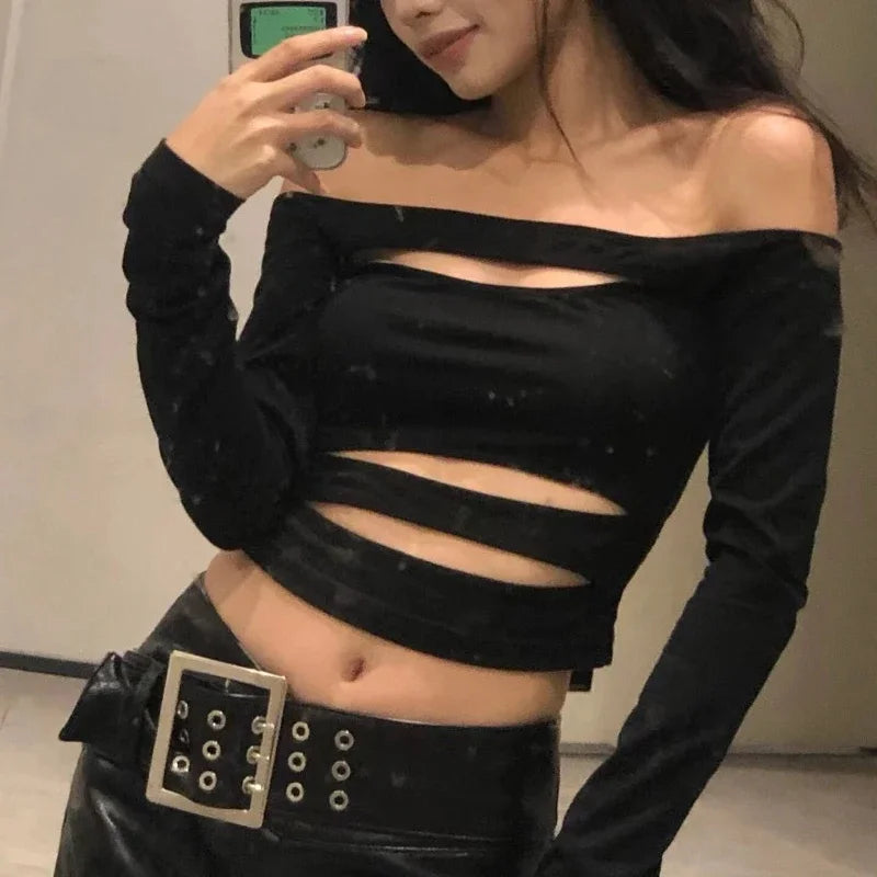 Lunivop Vintage Hollow Sexy Slim All Match Long-sleeved T-shirt Women 2024 Summer New Streetwear Strapless Casual Black Crop Tops
