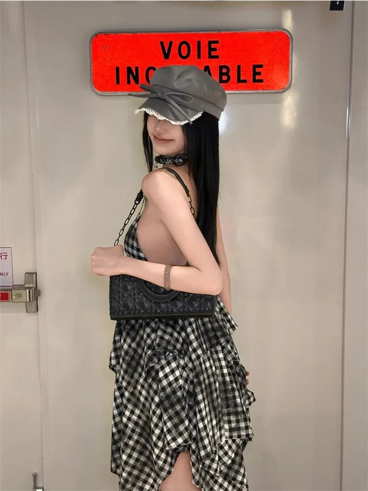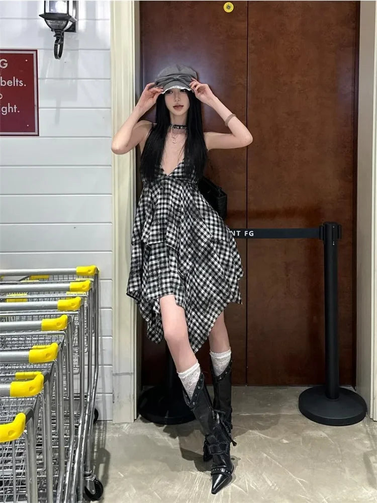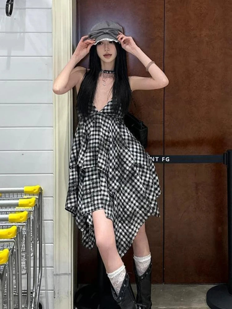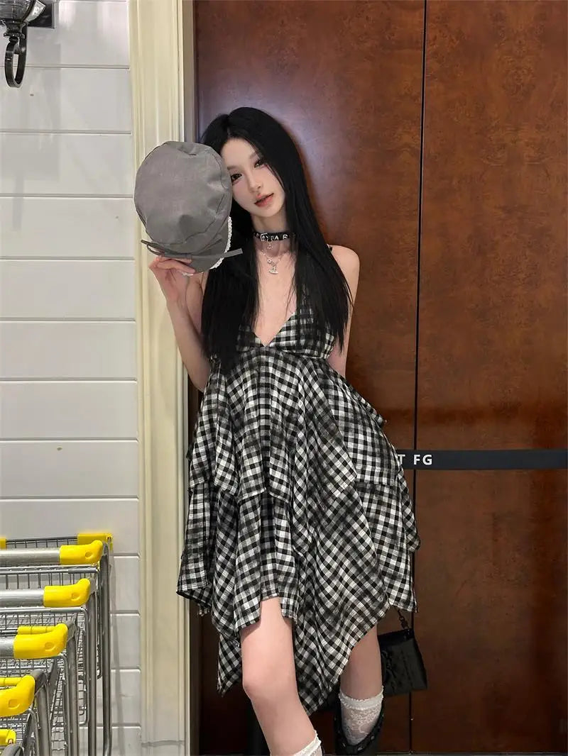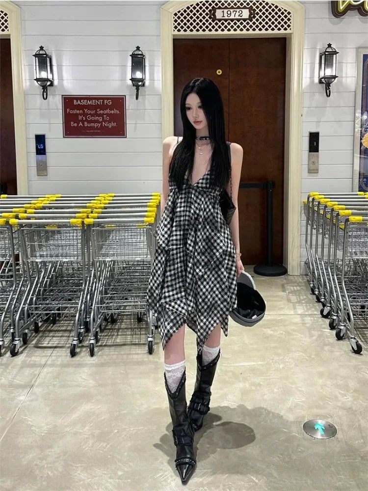 Lunivop Vintage Plaid Mini Dress Women Sexy Club Backless Irregular Dresses Korean Style V-neck Gyaru Streetwear Y2k Aesthetic