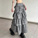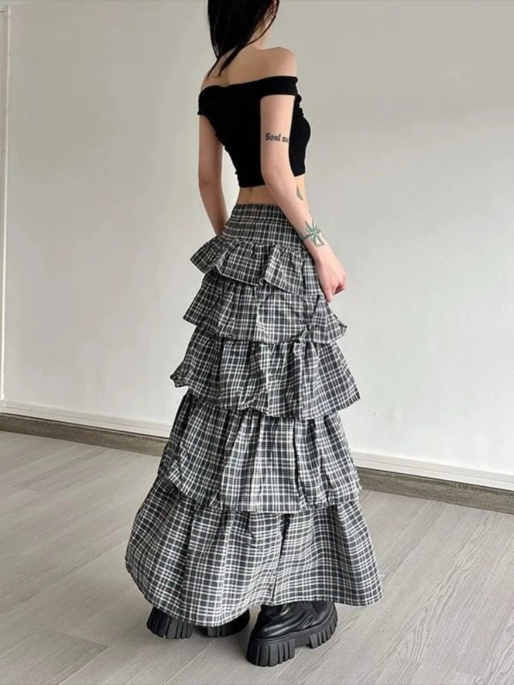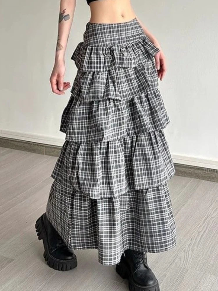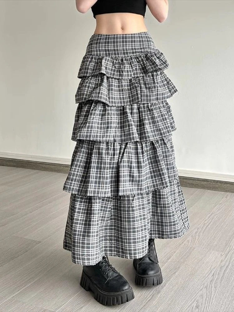 Lunivop Vintage Plaid Skirt Women Preppy Style Sweet Ruffle Cake Long Skirt Harajuku Fashion Patchwork Layered Skirts Street