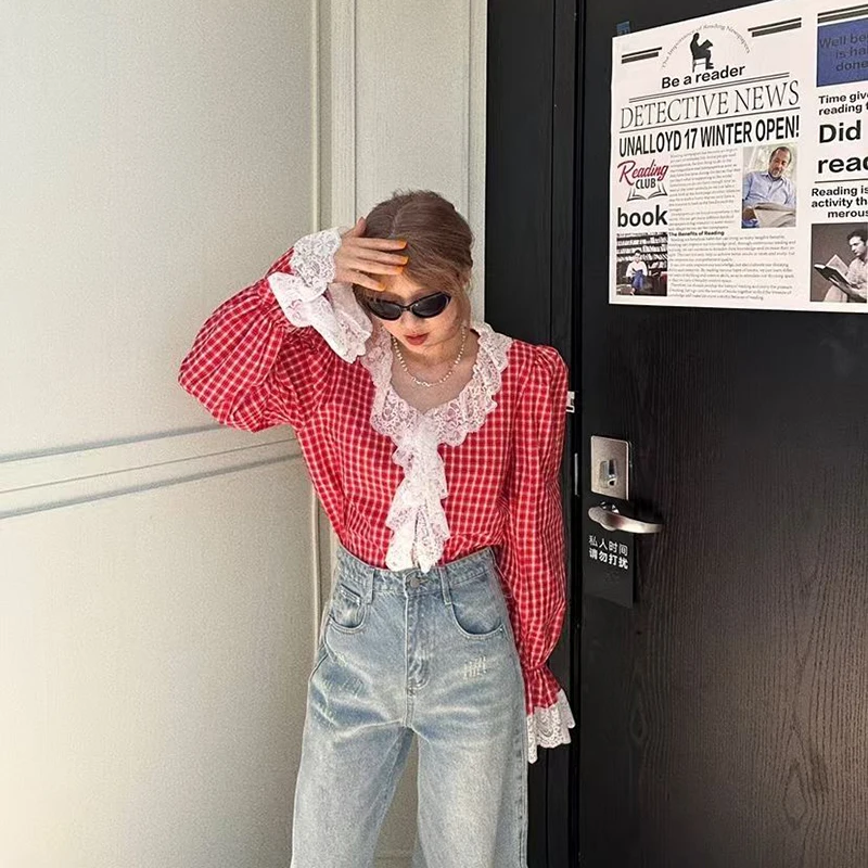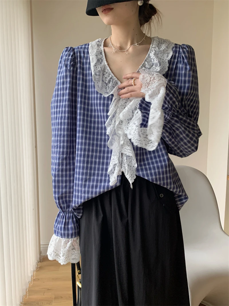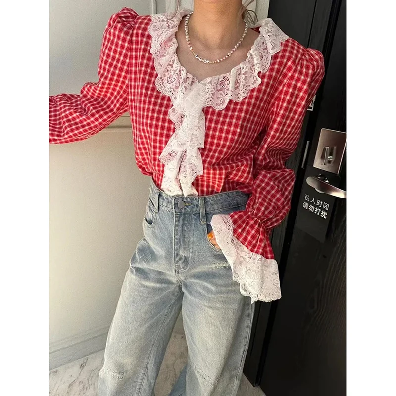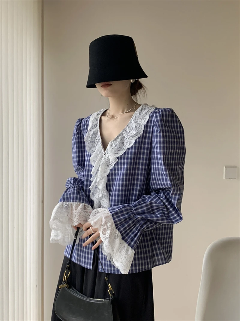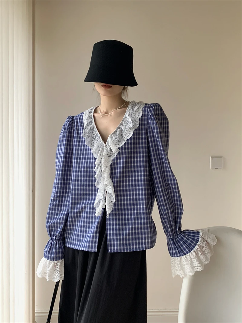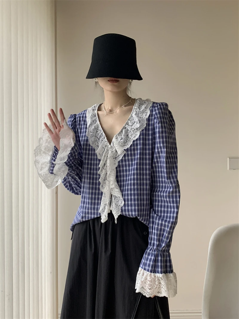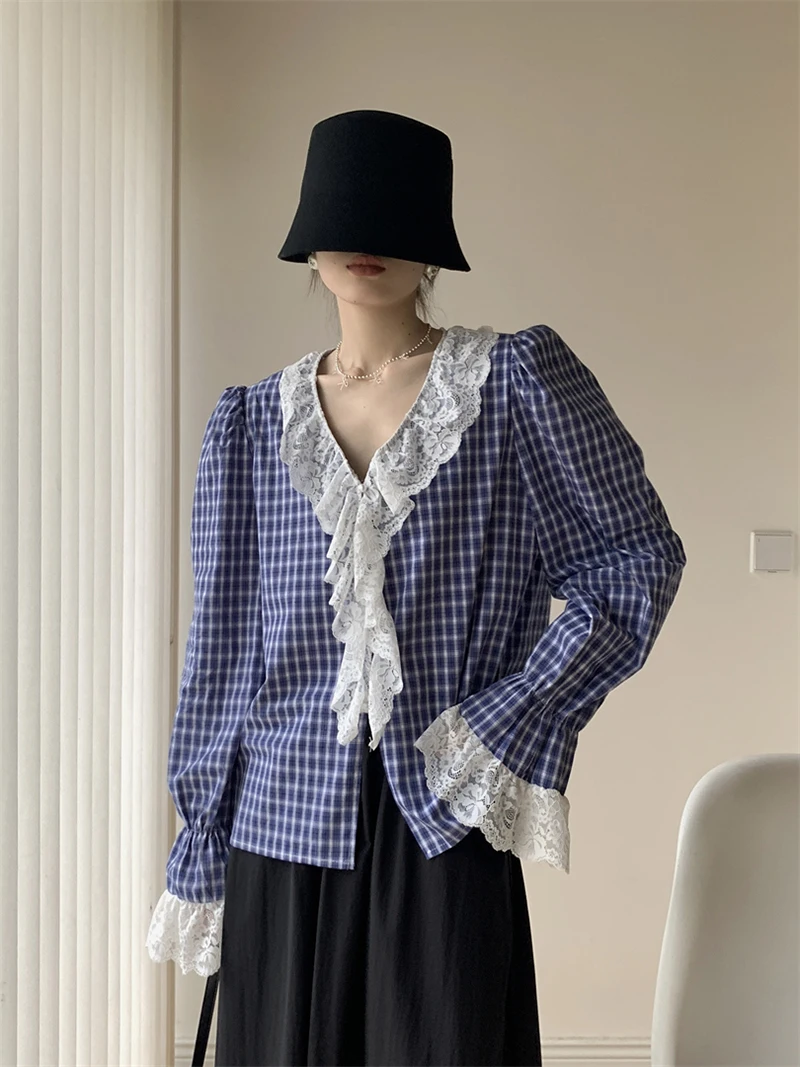 Lunivop Vintage Ruffles Plaid Shirt Women Elegant Lace Patchwork V Neck Blouse French Sweet Long Sleeve Retro Design Casual Tops
