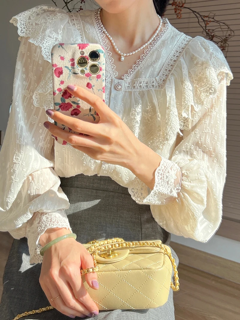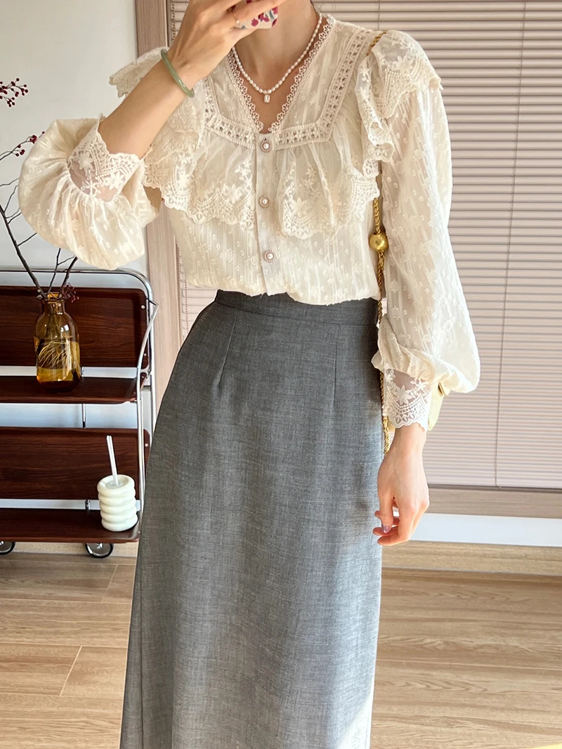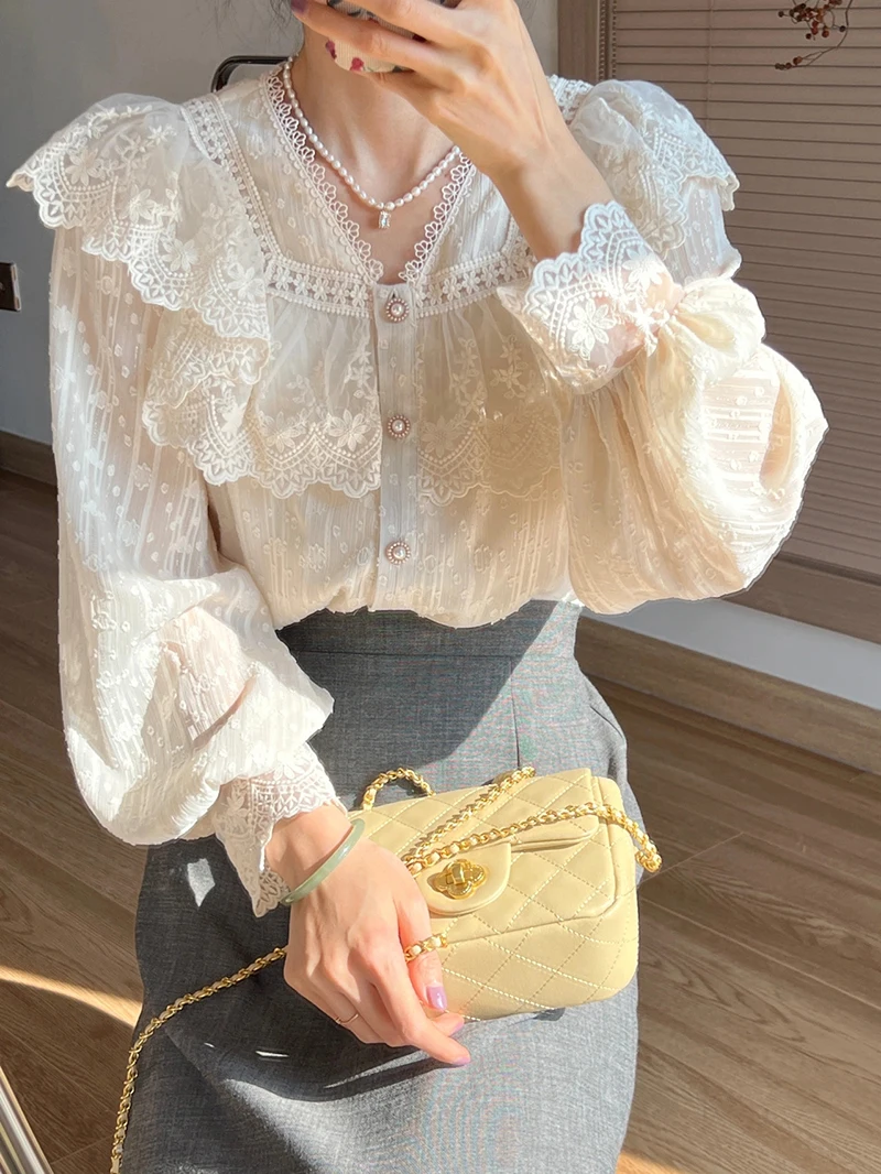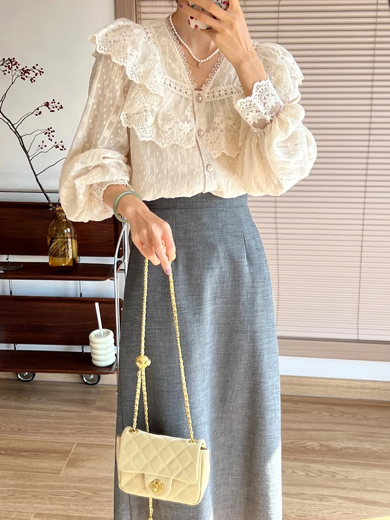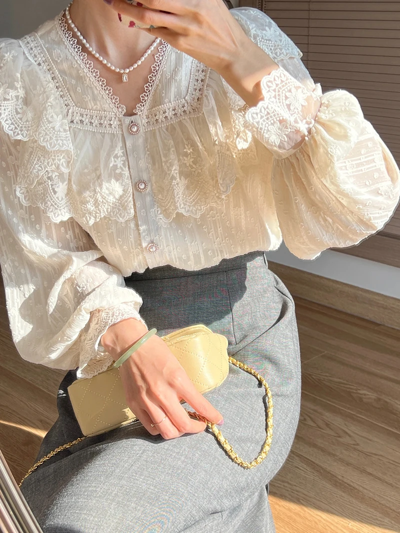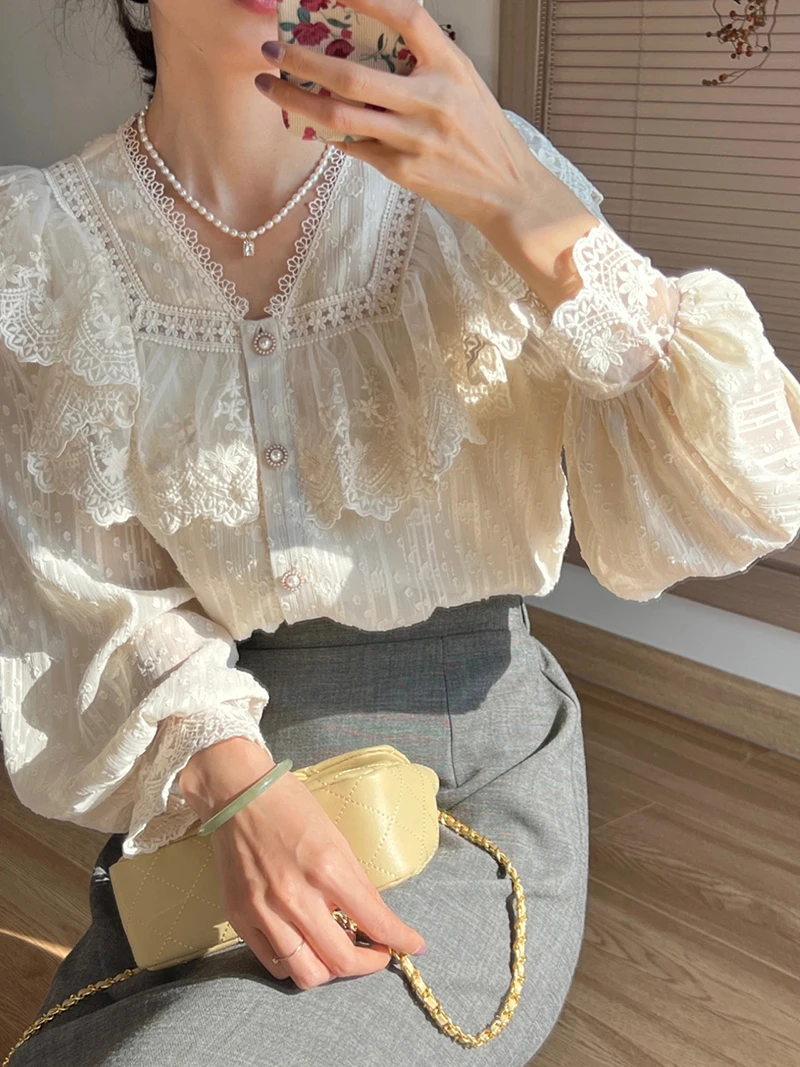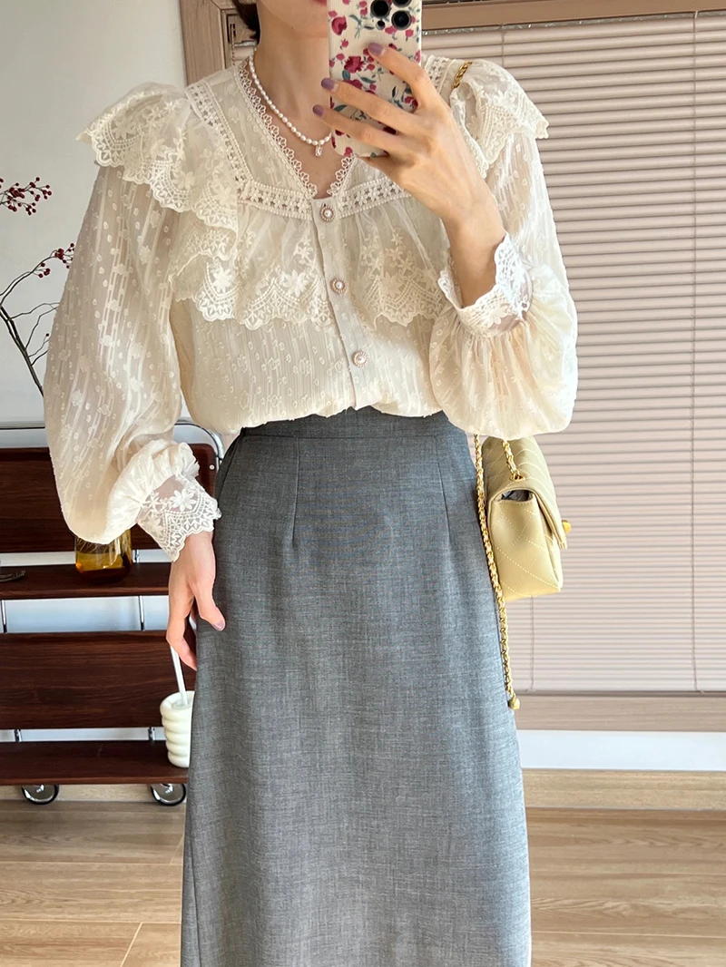 Lunivop Vintage Ruffles Shirts Women Elegant Lace Patchwork Blouses Office Lady Korean V Neck Long Sleeve All Match Chic Tops New