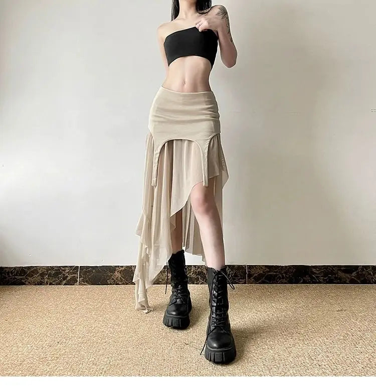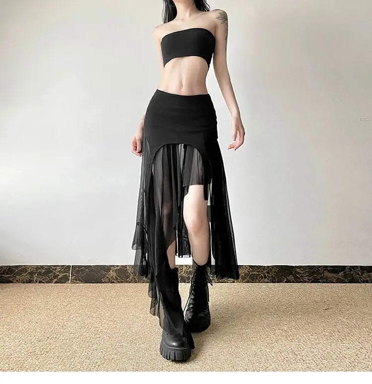 Lunivop Vintage Sexy Slit Skirt Women Y2k Elegant Irregular Sweet Ruffle Skirts Korean Style Tulle Streetwear Layered Skirts