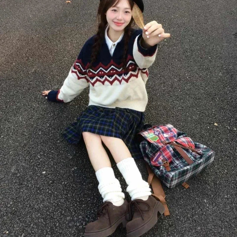 Lunivop Vintage Sweater Women Preppy Style Kawaii Knit Pullovers Japanese Style Patchwork Autumn Winter Retro Casual Sweaters
