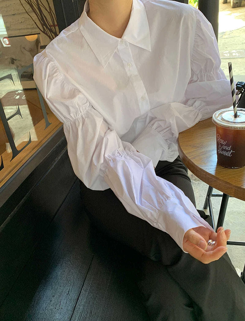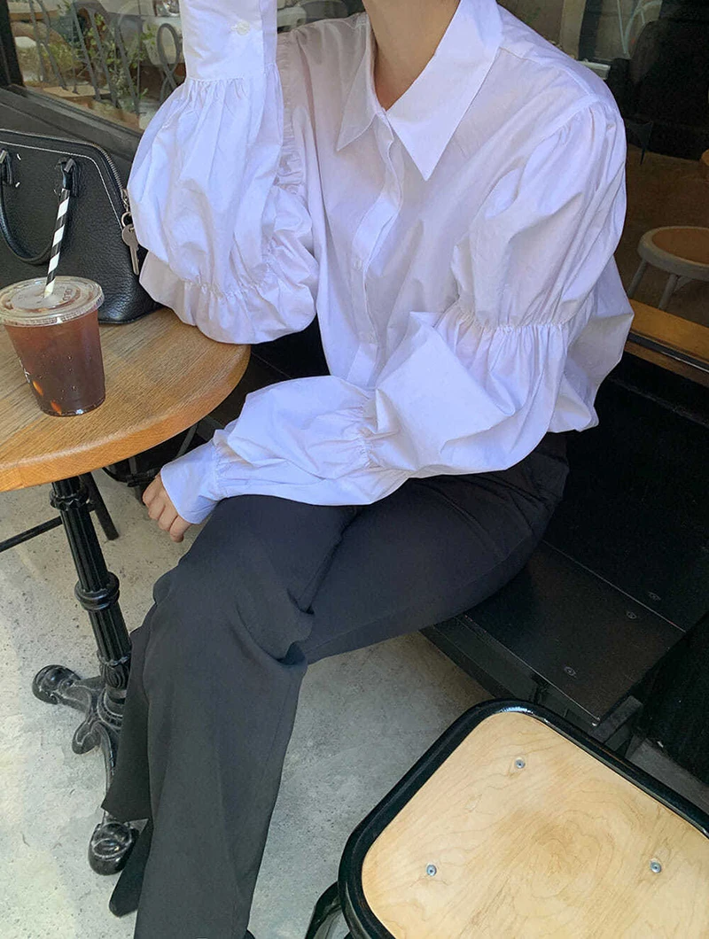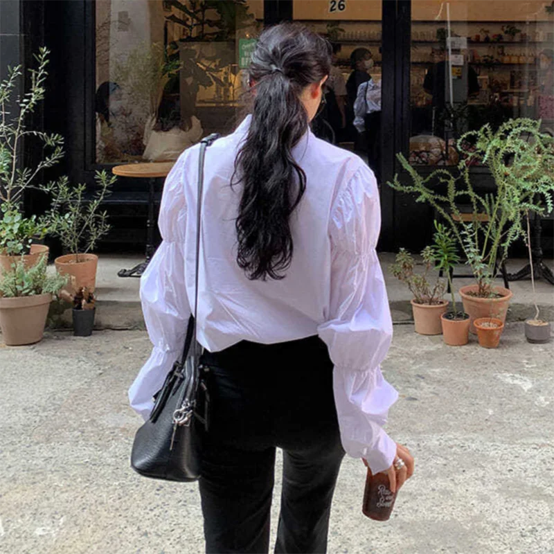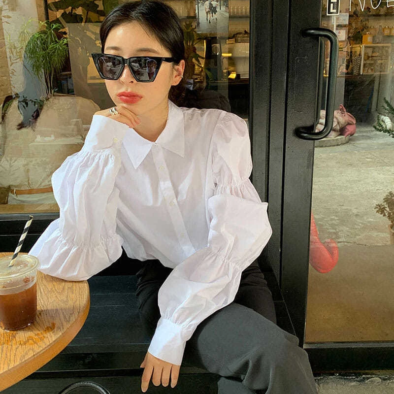 Lunivop Vintage White Shirts Women Puff Sleeve Folds Blouses Korean Streetwear Office Lady Elegant Solid Simple Loose Casual Tops