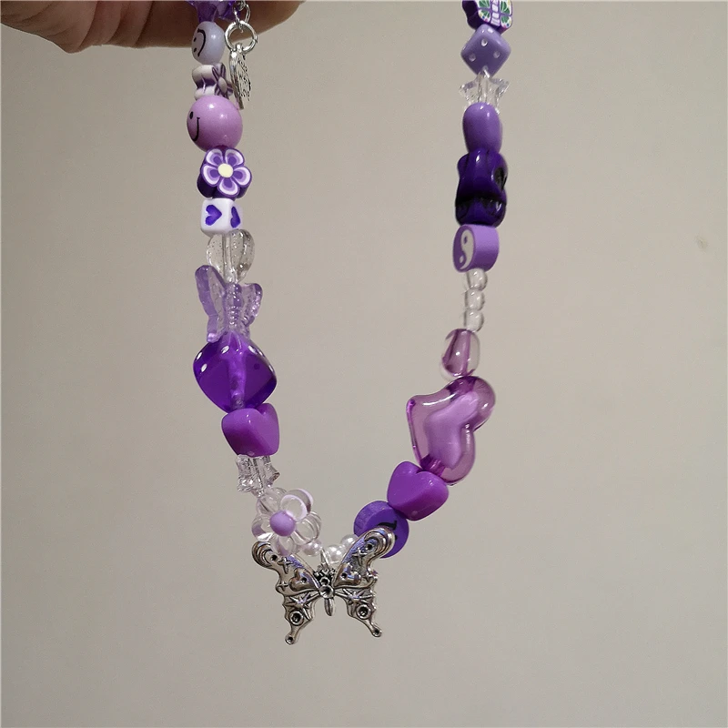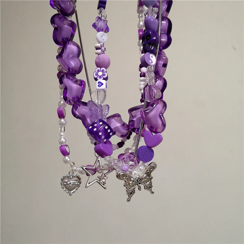 Lunivop Vintage Y2k Cute Heart Butterfly Pendant Purple Acrylic Beaded Chain Choker Necklace Goth Egirl Aesthetic EMO Grunge Accessories