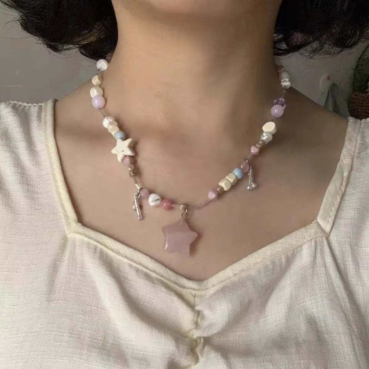 Lunivop Vintage Y2K Star Pentagram Beaded Choker Necklace For Women Sweet Cool Trendy Collar Chain Harajuk Jewelry Accessories