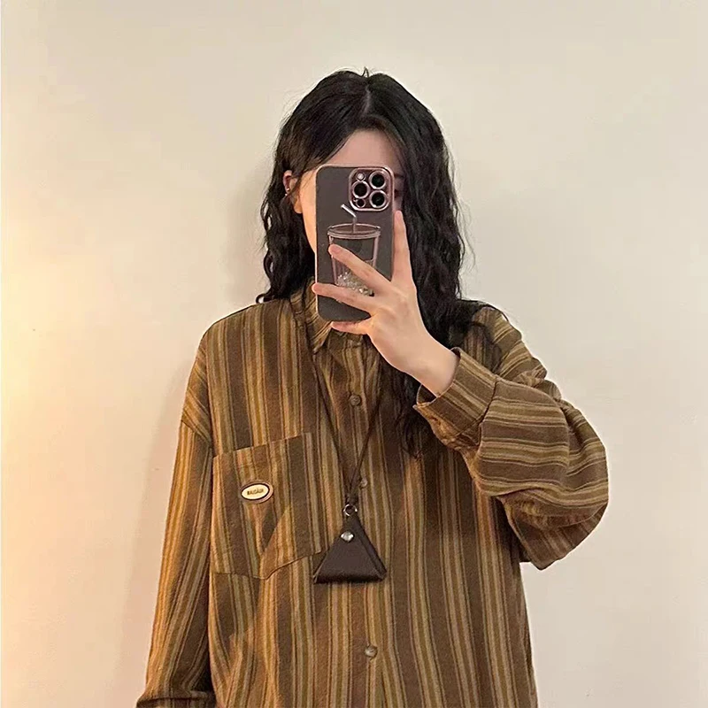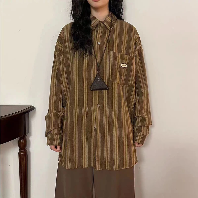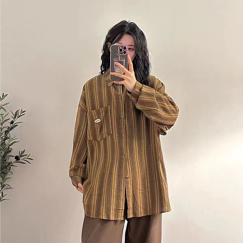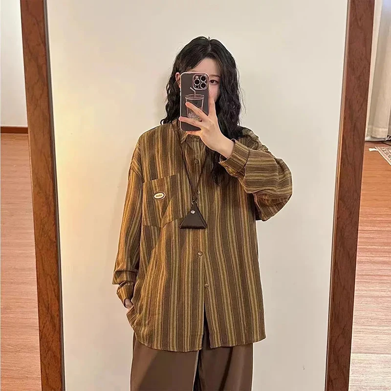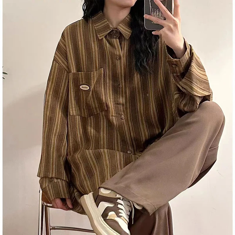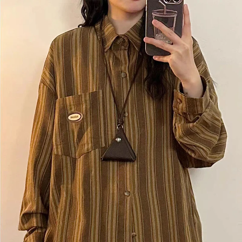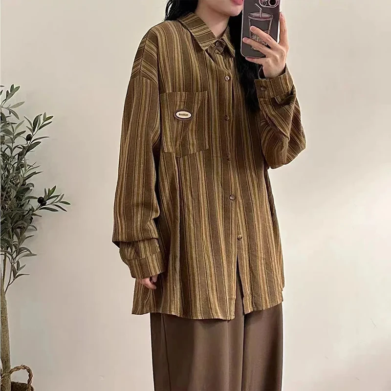 Lunivop Vintage Y2K Striped Shirt Women Harajuku Oversize Loose Japan Blouse Casual Long Sleeve Streetwear Bf Pocket Design Tops