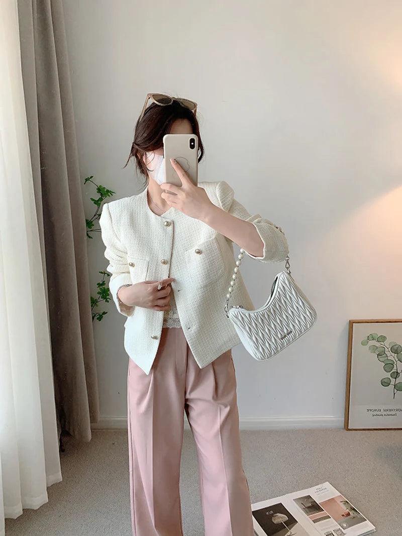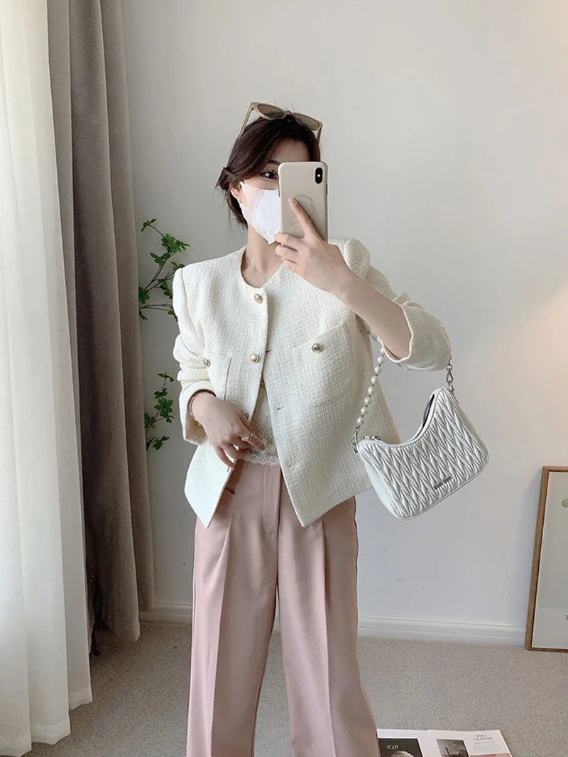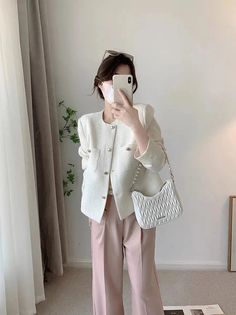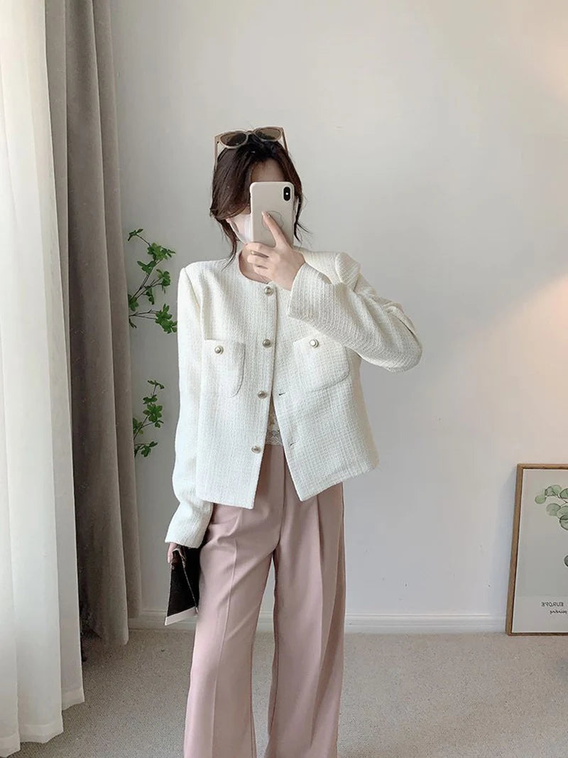 Lunivop White Elegant Tweed Jacket Women Slim Long Sleeve O Neck Chic Sweet Short Coat Fall Winter French Female Fashion New Tops