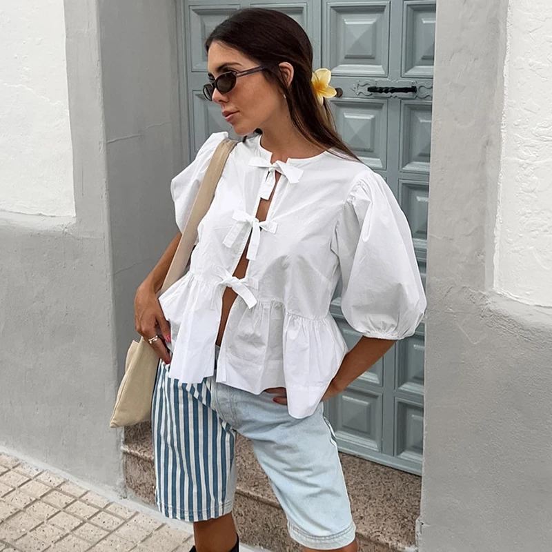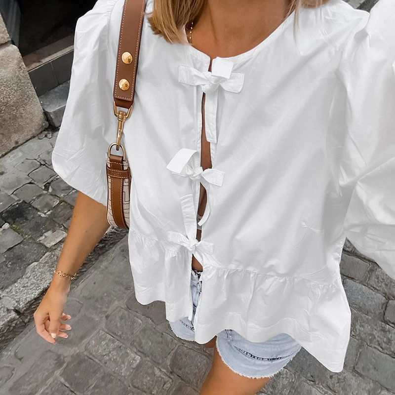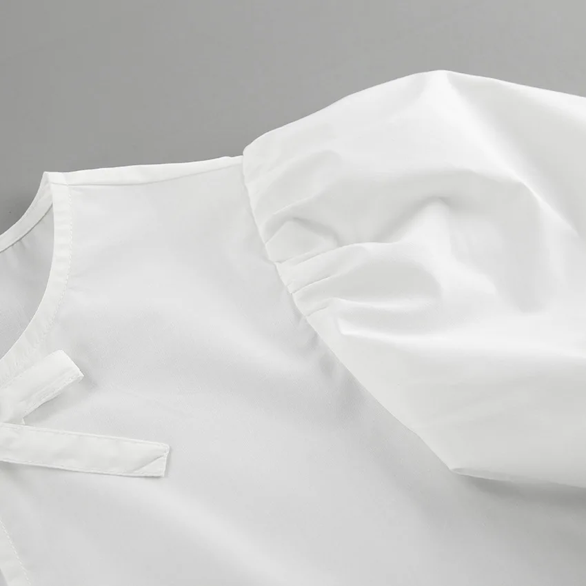 Lunivop White Hollow Out Lace Up Puff Sleeve Shirt For Women O-Neck Summer Fashion New Patchwork Shirt Top Female Loose Clothes