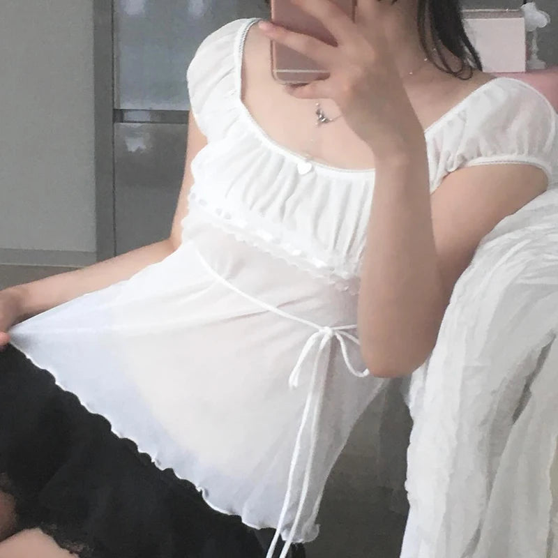 Lunivop White Mesh Transparent Crop Top y2k Aesthetic Folds Stitching Short Sleeve T Shirts Korean Style Cute Tees Sexy Clubwear