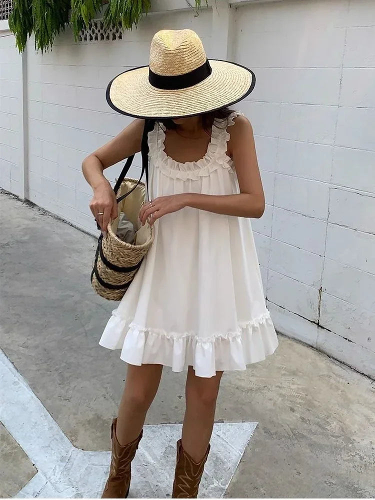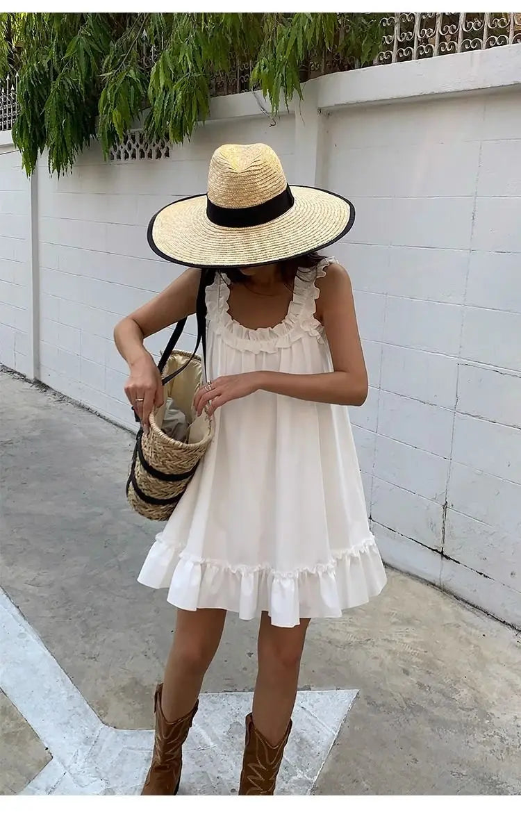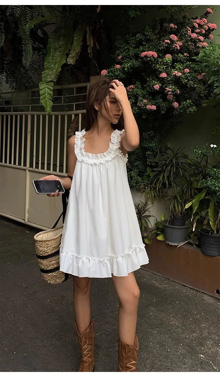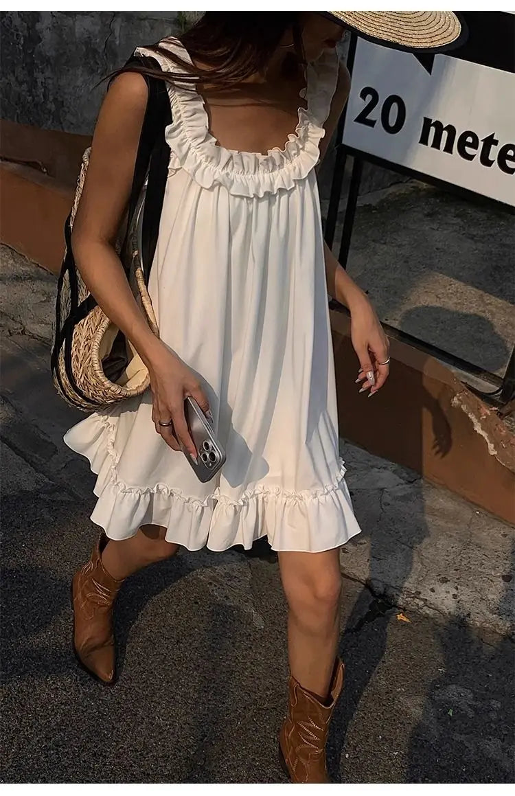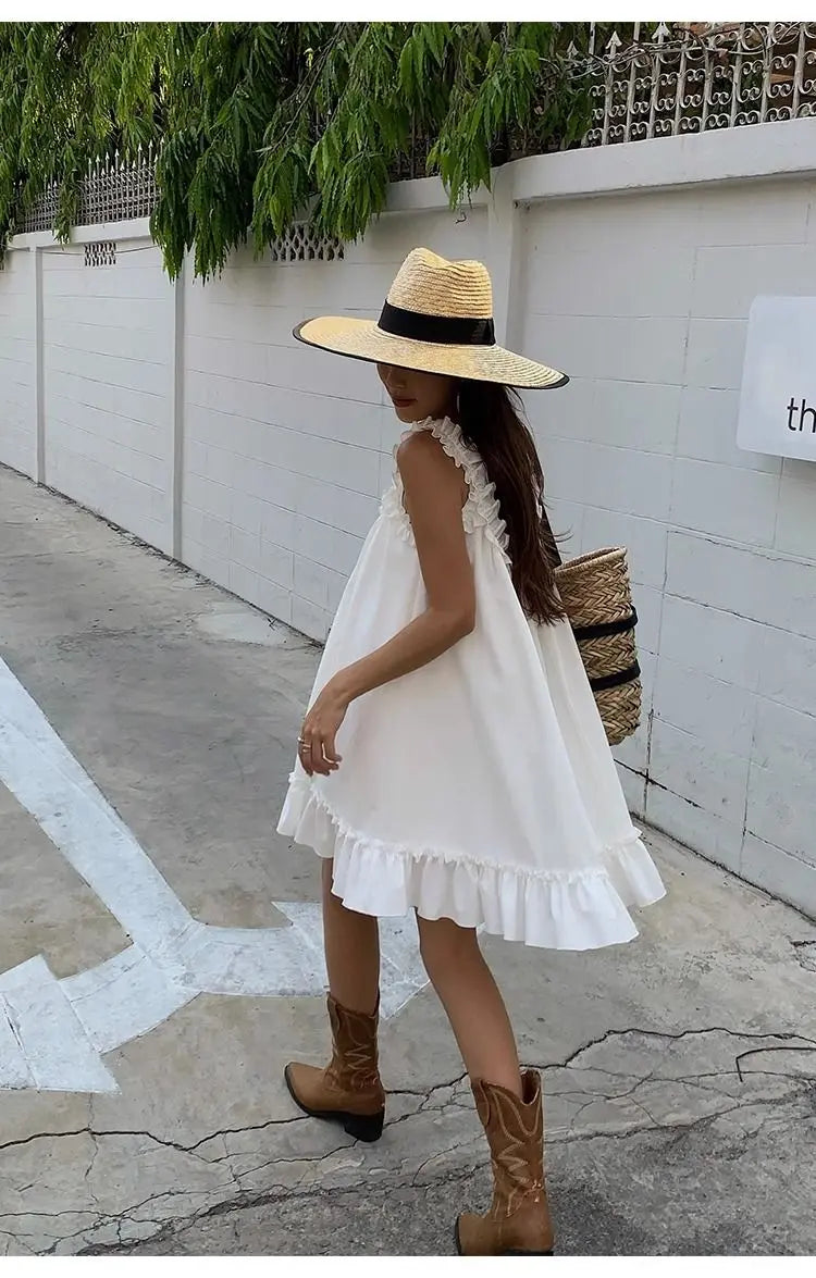 Lunivop White Sleeveless Ruffles Mini Dress Women Casual Boho Beach Sundress Cute Girl Home Dresses Loose Summer Dress Oversize