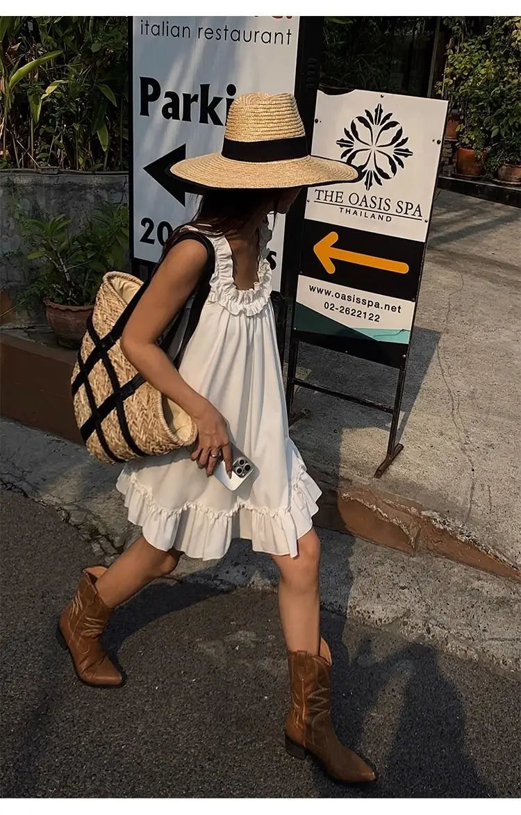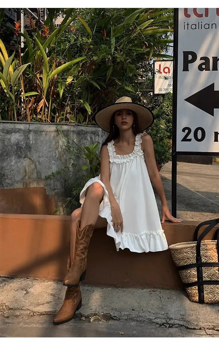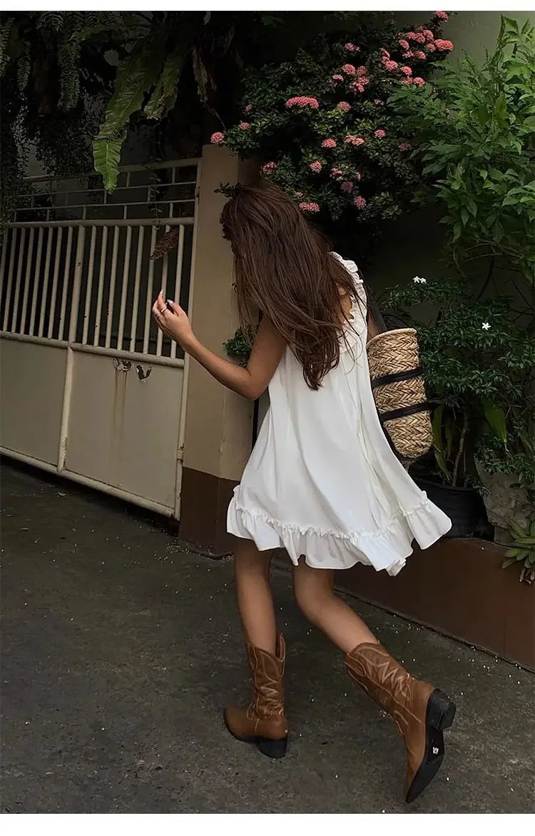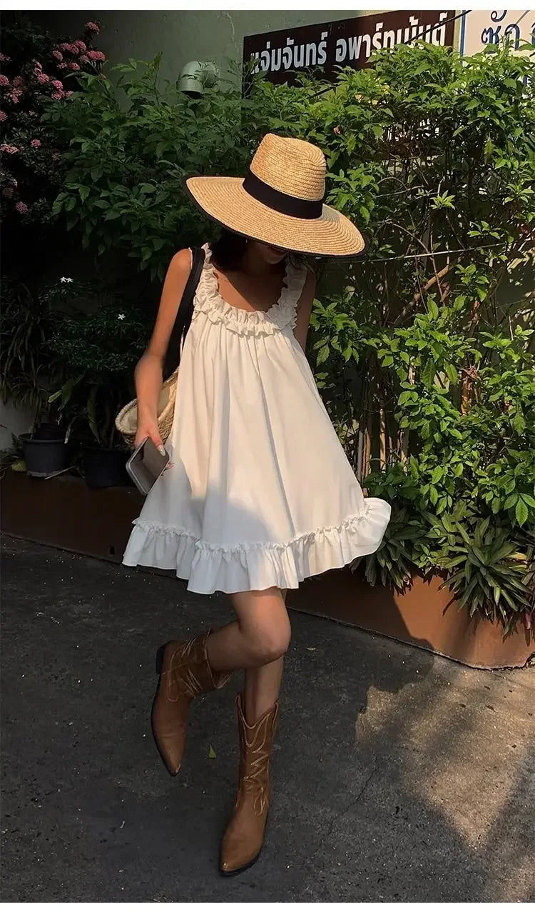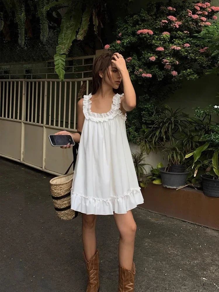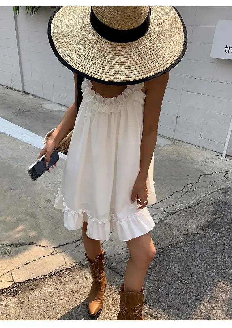 Lunivop White Sleeveless Ruffles Mini Dress Women Casual Boho Beach Sundress Cute Girl Home Dresses Loose Summer Dress Oversize