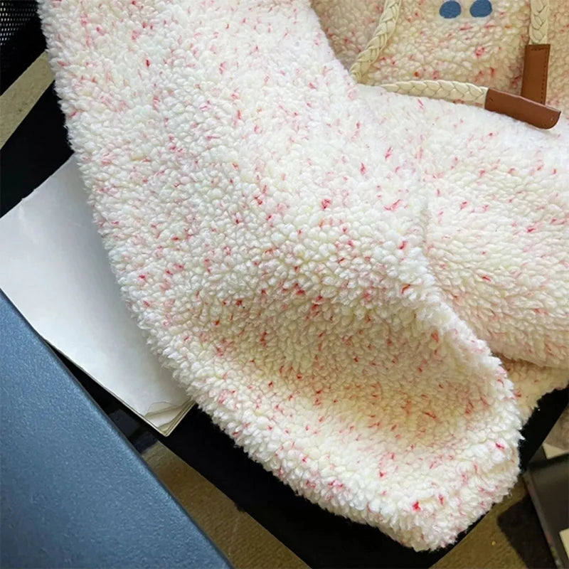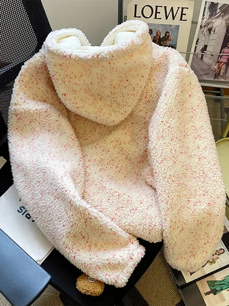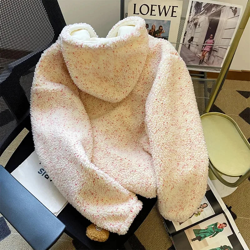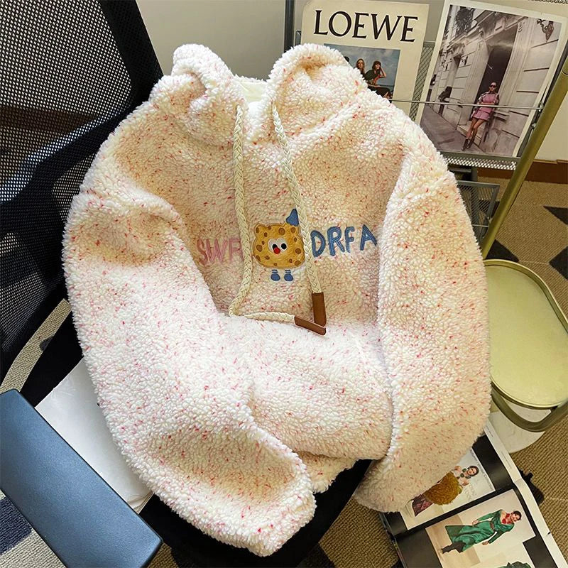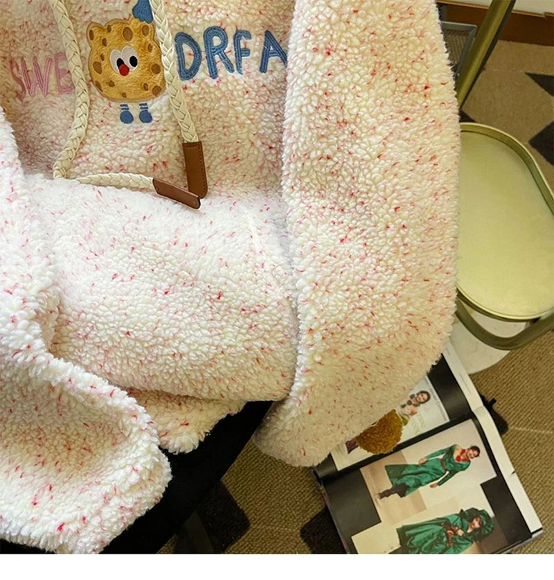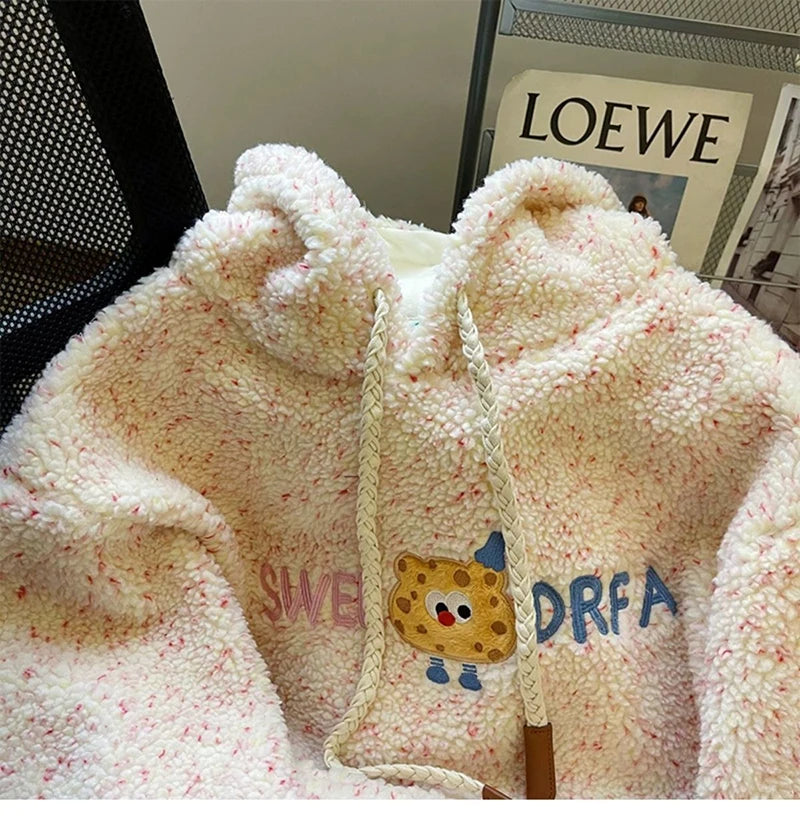 Lunivop Winter Faux Lamb Sweet Coat Women Cute Cartoon Embroidery Warm Jacket Casual Loose Long Sleeve Korean Fashion Hooded Tops