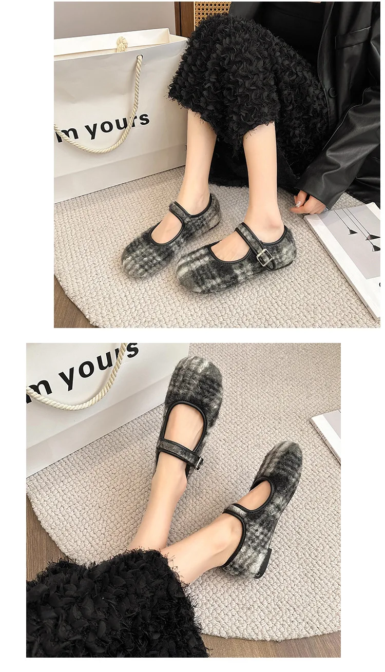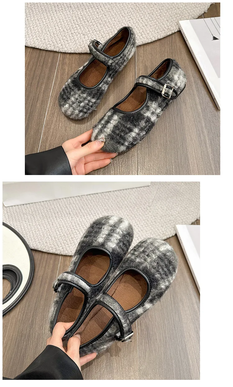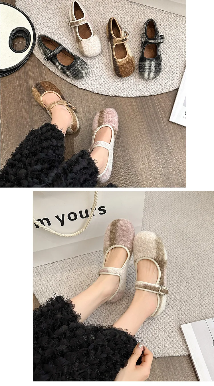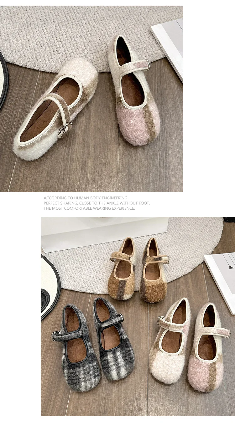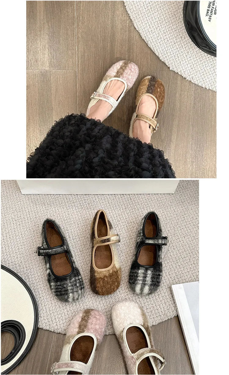 Lunivop Winter Shoes for Women Flats Wool Mary Janes Shoes Plaid Warm Boat Shoes Buckle Strap Plush Ballet Flats Autumn Loafers