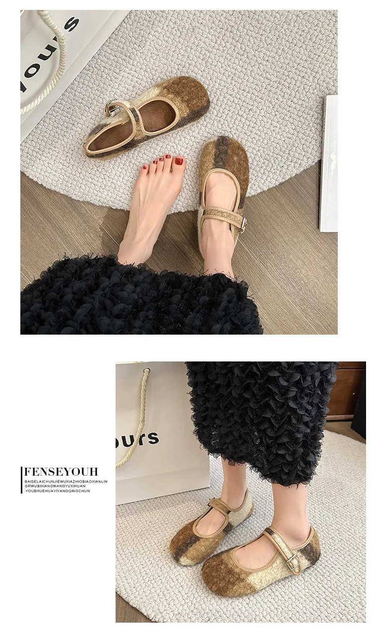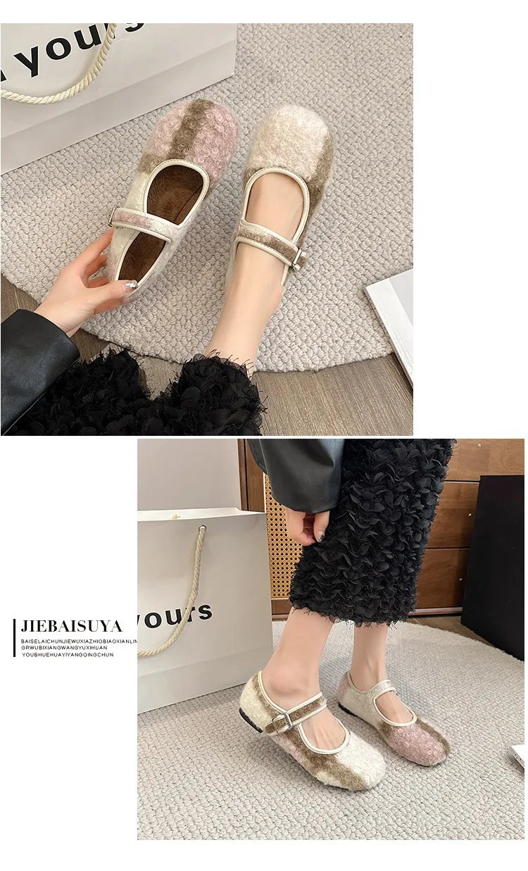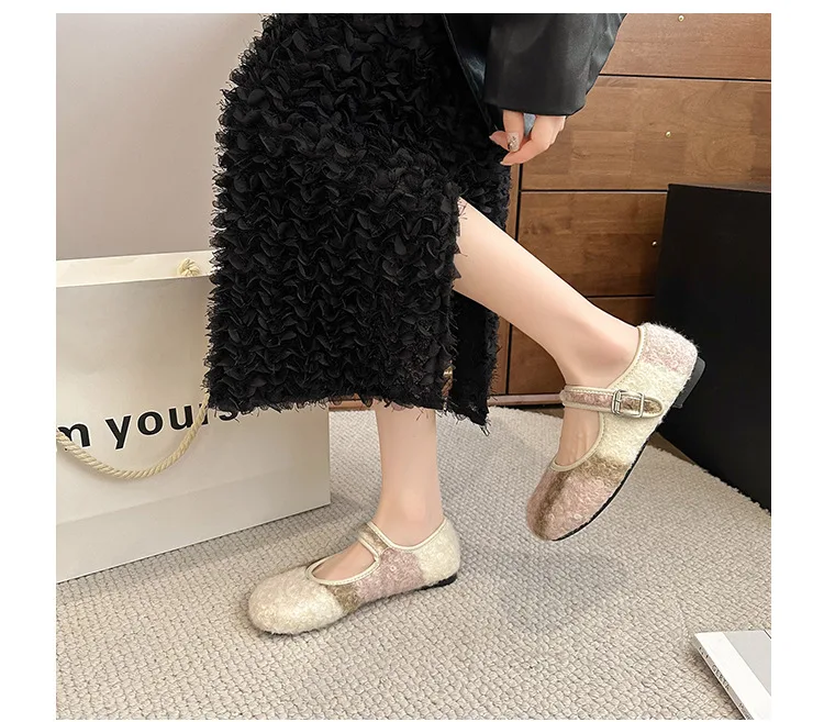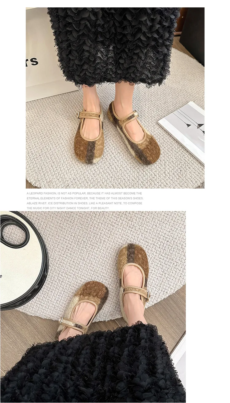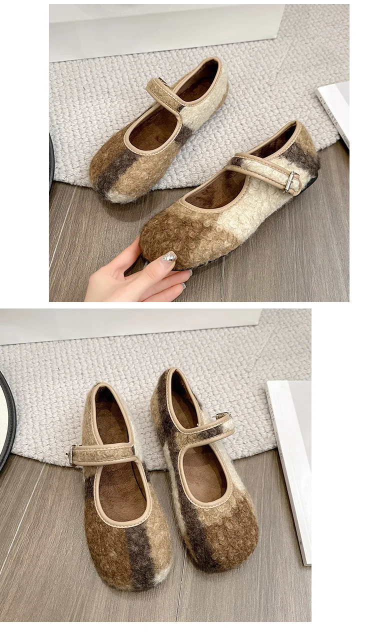 Lunivop Winter Shoes for Women Flats Wool Mary Janes Shoes Plaid Warm Boat Shoes Buckle Strap Plush Ballet Flats Autumn Loafers
