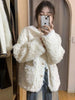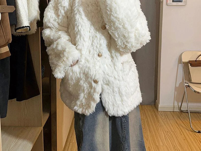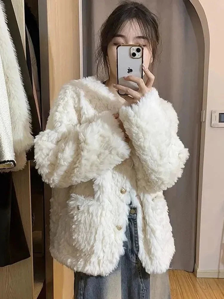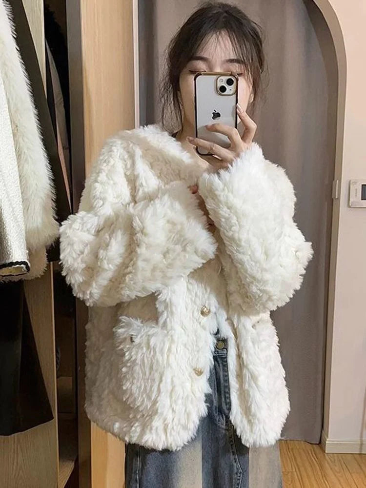 Lunivop Winter Sweet Korean Faux Lamb Coat Women Vintage Warm Thick Long Sleeve Cute Jacket Casual O Neck Pockets Elegant White Tops New