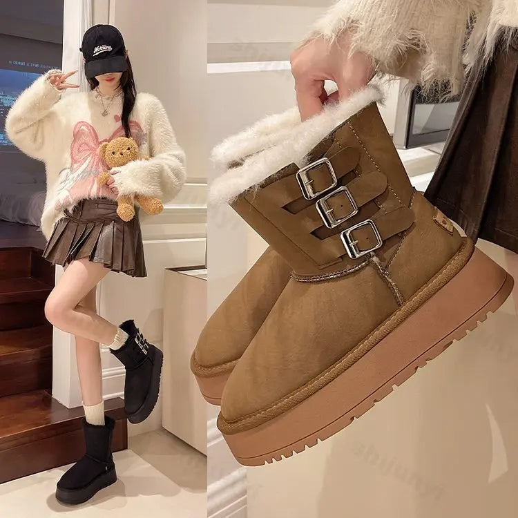 Lunivop Winter Women Boots Platform Shoes Keep Warm Mid-Calf Snow Boots Ladies Side Buckle Comfortable Brown Long Boots Zapatos De Mujer