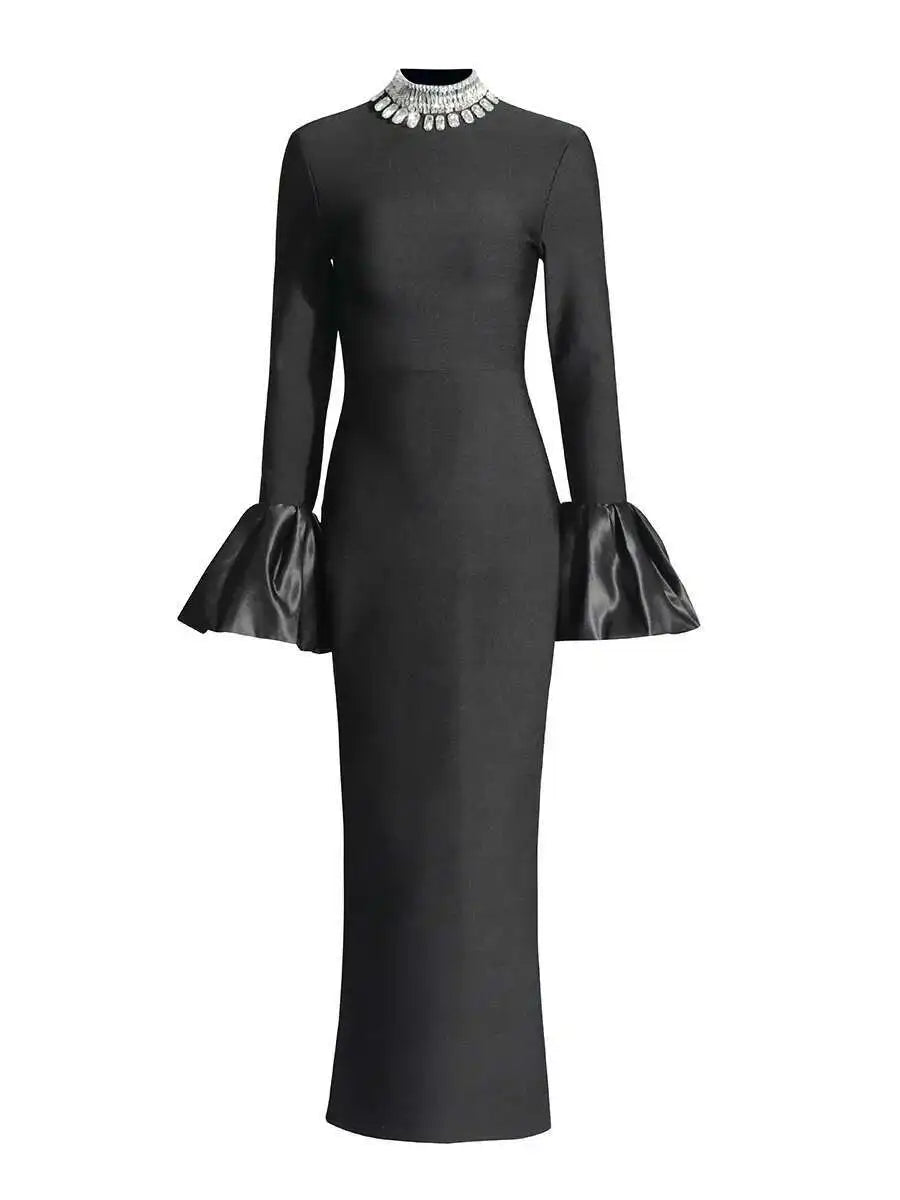 Lunivop Woemn's Evening Dress Diamonds Collar Flare Long Sleeve High Waist Sliming Elegant Party Dress 2025 New Clothing
