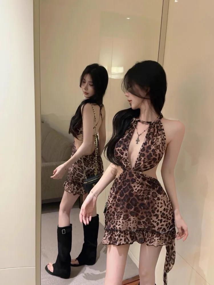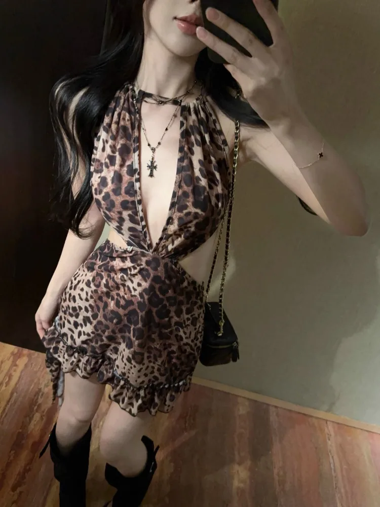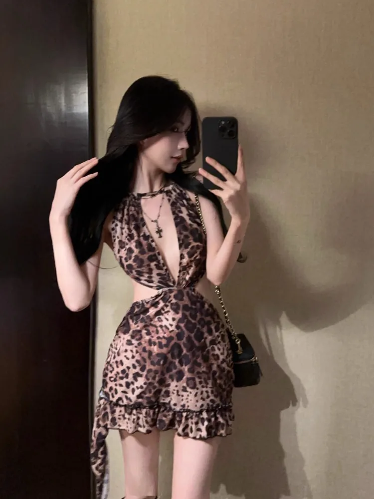 Lunivop Woman Dress Sexy Leopard Printed Backless Hollow Out Slim Irregular Ruffles Bandage Sleeveless Mini Dresses Party Ladies