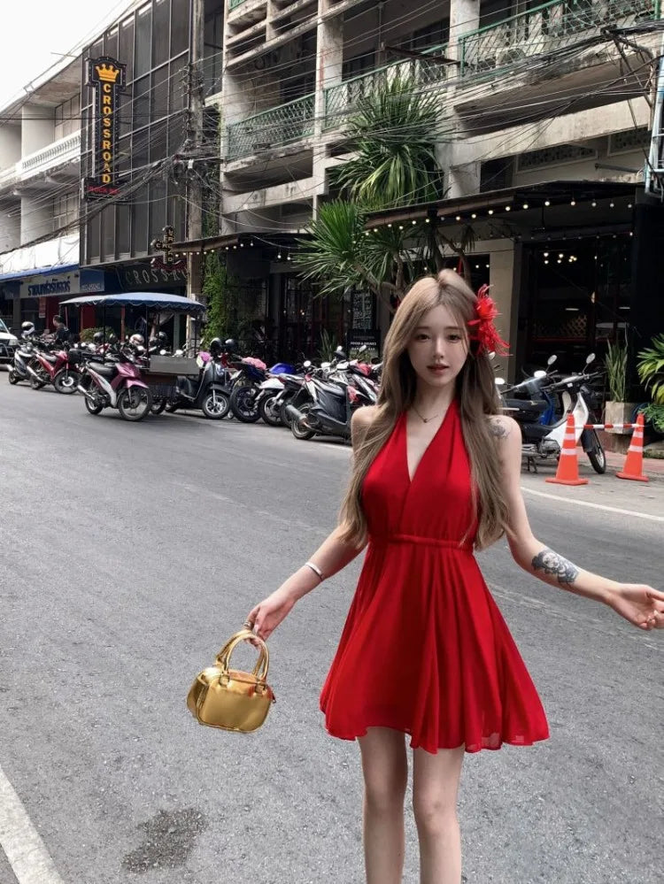 Lunivop Woman Dresses Sleeveless V Neck Bandage Halter Backless Vintage Sexy Mini Dress Sweet Elegant Female Party Fashion