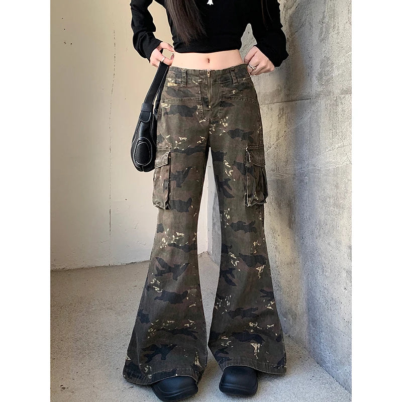 Lunivop Women American Vintage Low Rise Camouflage Bell Bottoms Y2k Japanese Streetwear Denim Pants Harajuku Long Trousers 2000s Jean