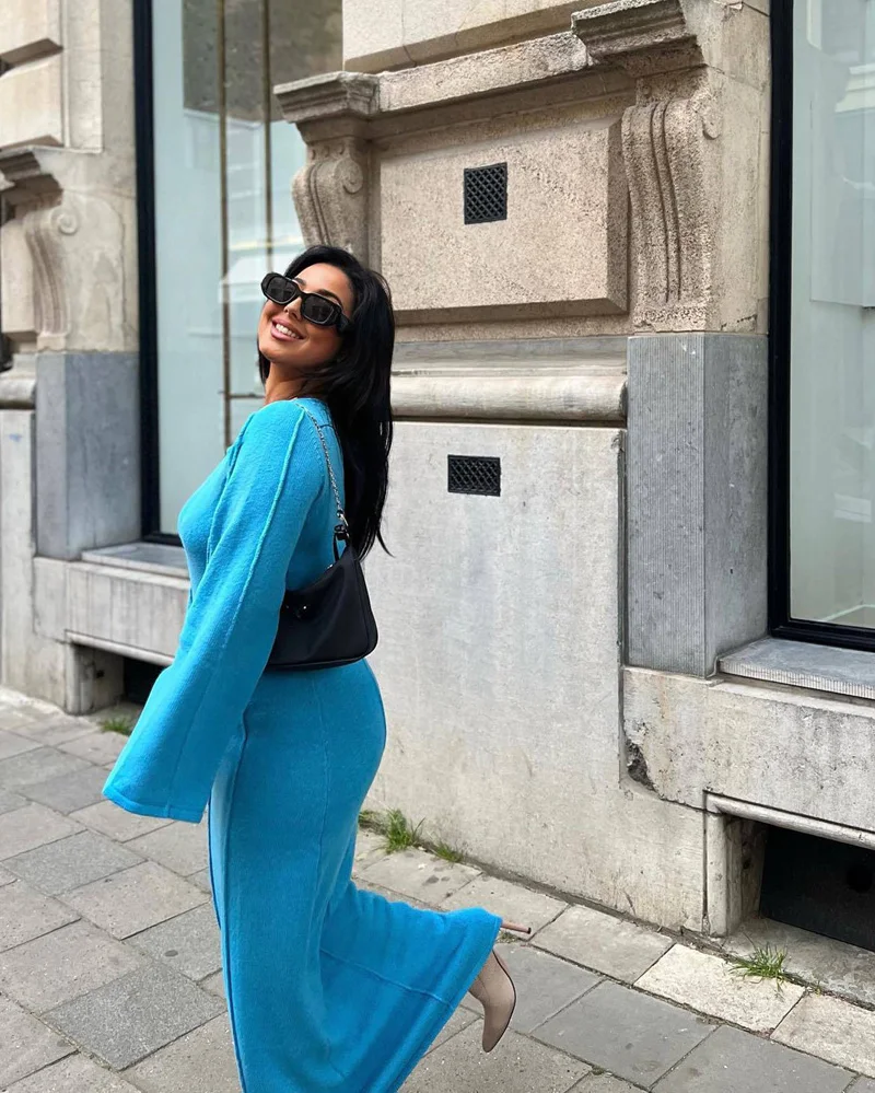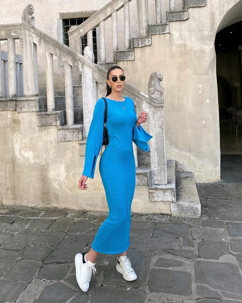 Lunivop Women Autumn Winter Knitted Midi Bodycon Dresses Sexy Long Sleeve Slim Fit Solid Blue Pencil Sweater Dress
