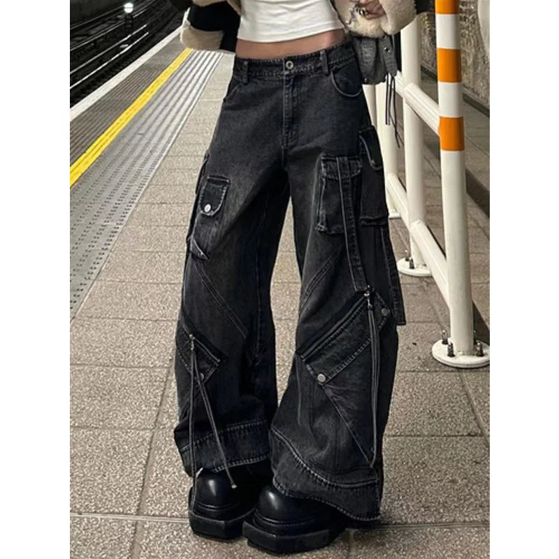 Lunivop Women Black Jeans Cargo Pants Streetwear High Waist American Wide Leg Pants Fashion Y2K Style Female Winter Straight Trousers
