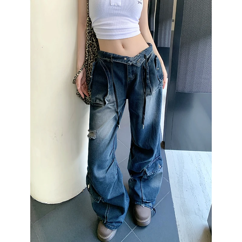 Lunivop Women Blue Cargo Jeans Harajuku Baggy Y2k Ripped Denim Trousers Aesthetic Jean Pants Vintage Japanese 2000s Style Trashy Clothes