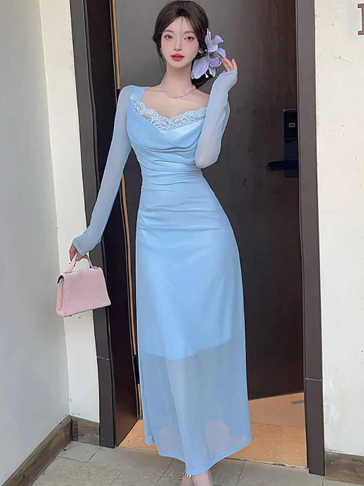 Lunivop Women Blue Mesh Patchwork Lace Square Collar Long Dress Summer Elegant Casual Dress with Long Sleeve Korean Bodycon Dresses