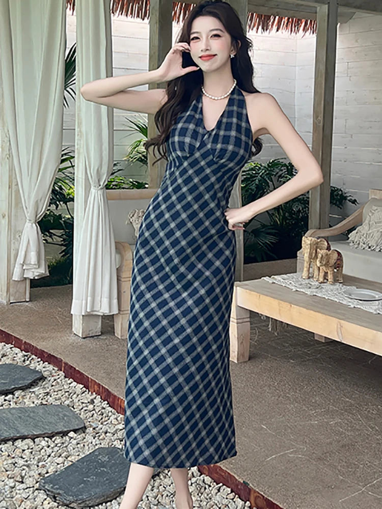 Lunivop Women Blue Plaid Chic Bow Neck-mounted Long Dress Summer Elegant Casual A-Line Dress Korean Vintage Luxury Evening Dresses