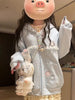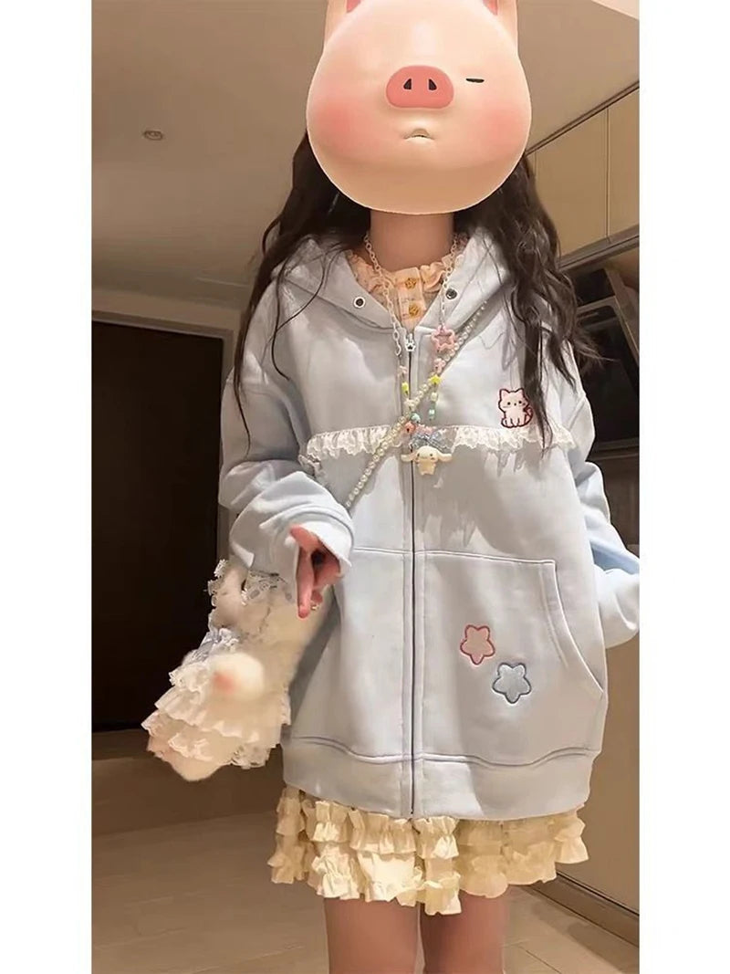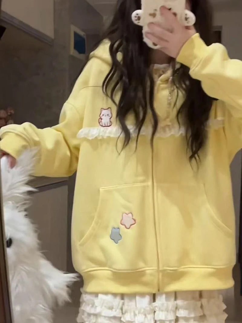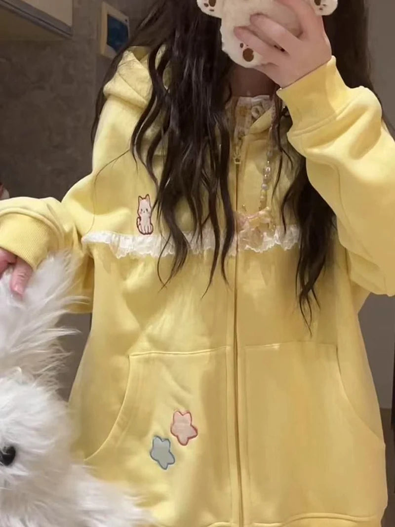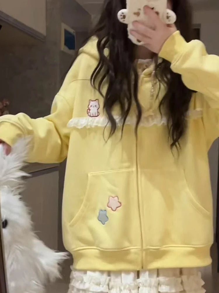 Lunivop Women Cute Cartoon Hoodies Vintage Lace Patchwork Loose Sweet Sweatshirts Fall Preppy Style Japan Pockets Lady Kawaii Tops