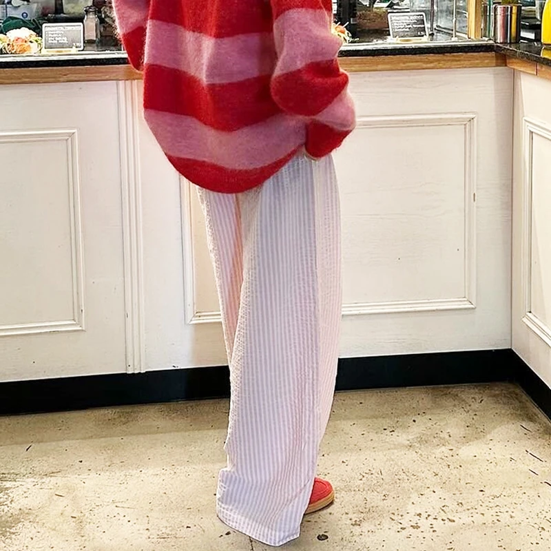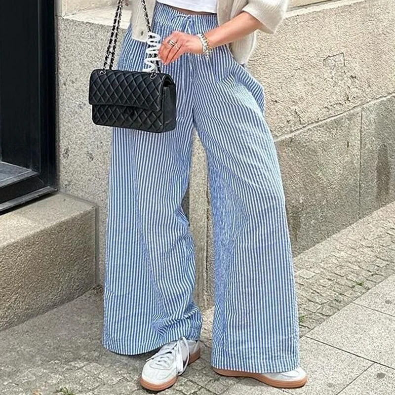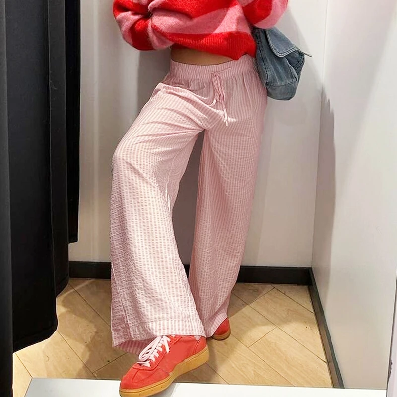 Lunivop Women Drawstring Waistband Loose Wide Leg Pants Striped Print Long Baggy Pants Casual Lounge Trousers Y2k Vintage Streetwear