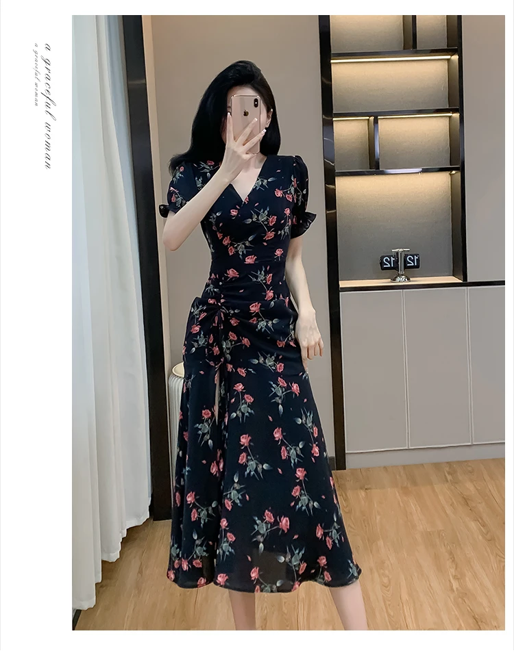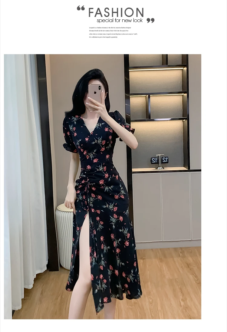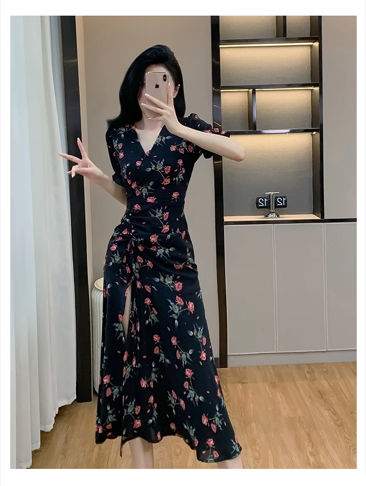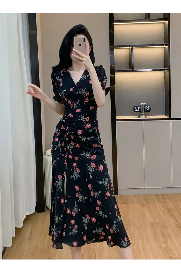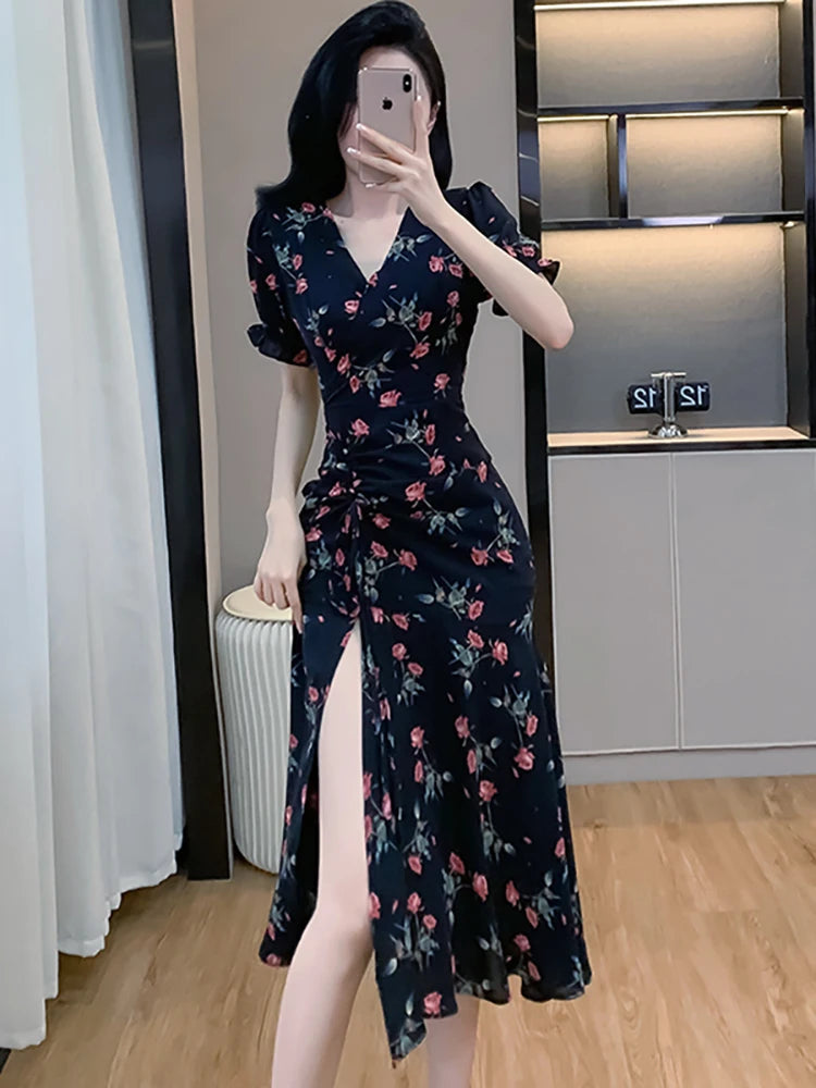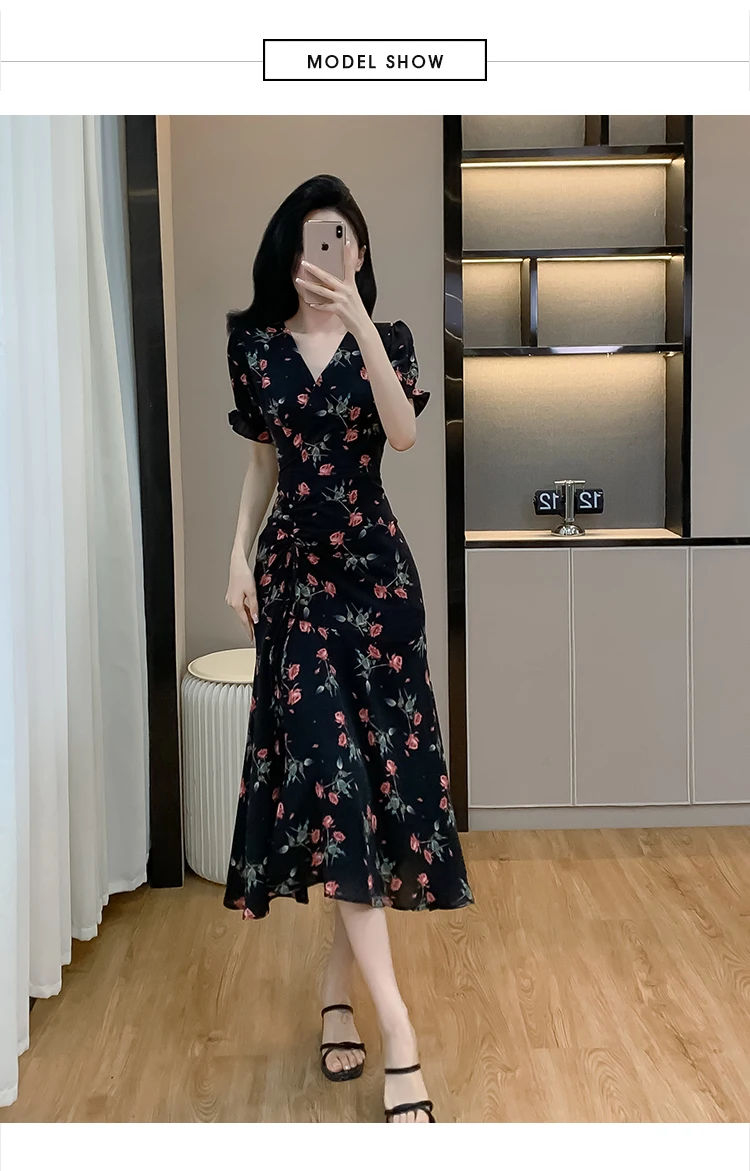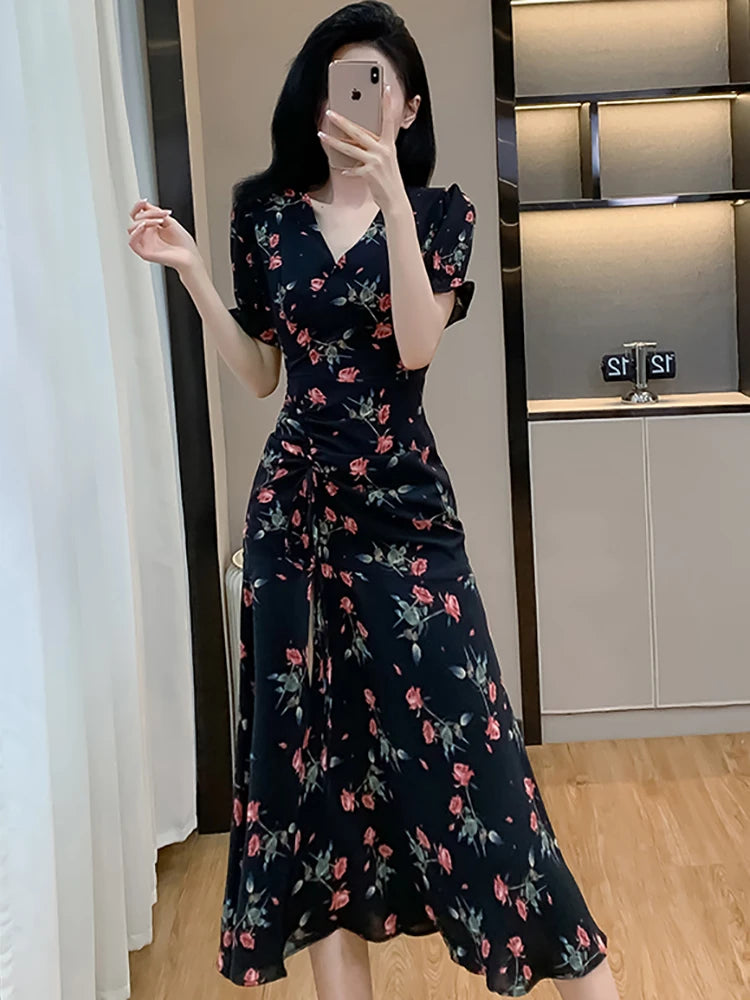 QAJAREL New Arrival High Quality Women Elegant Long One-piece Dress Gown Summer Black Floral Puff Sleeve V-Neck Luxury Dress Korean Bodycon Festival Dresses