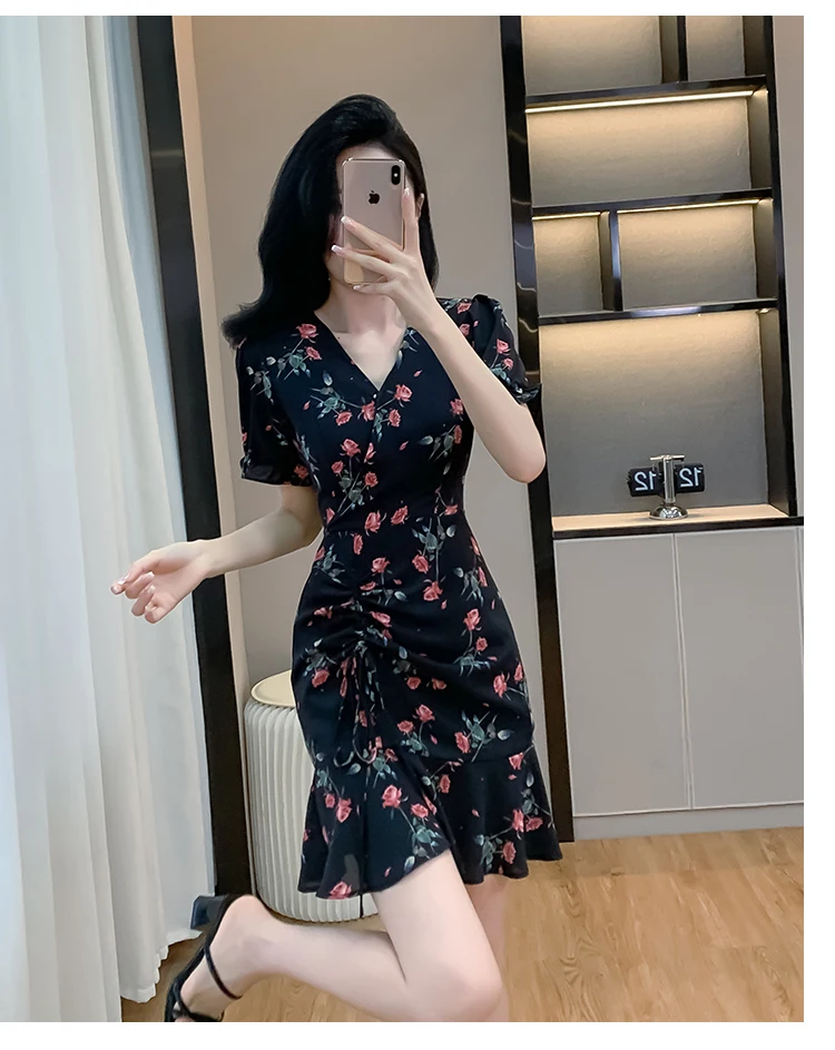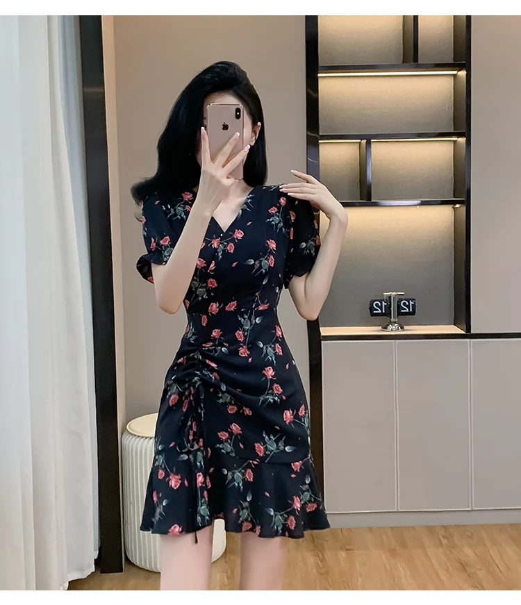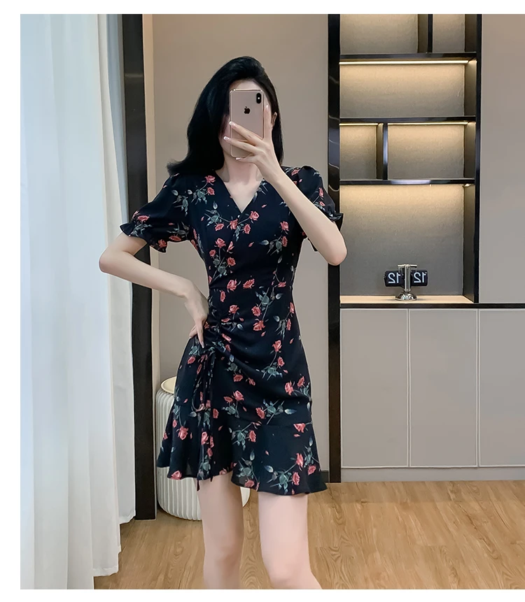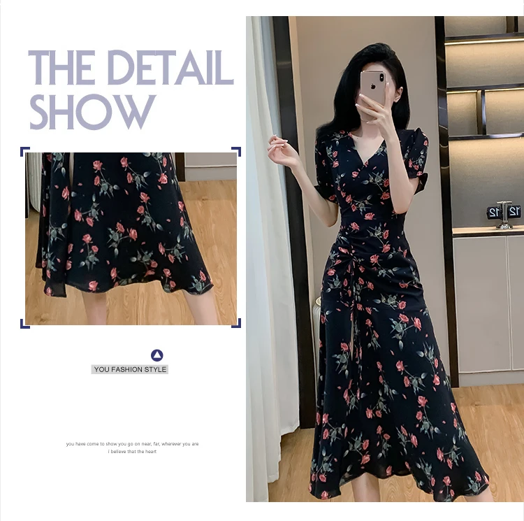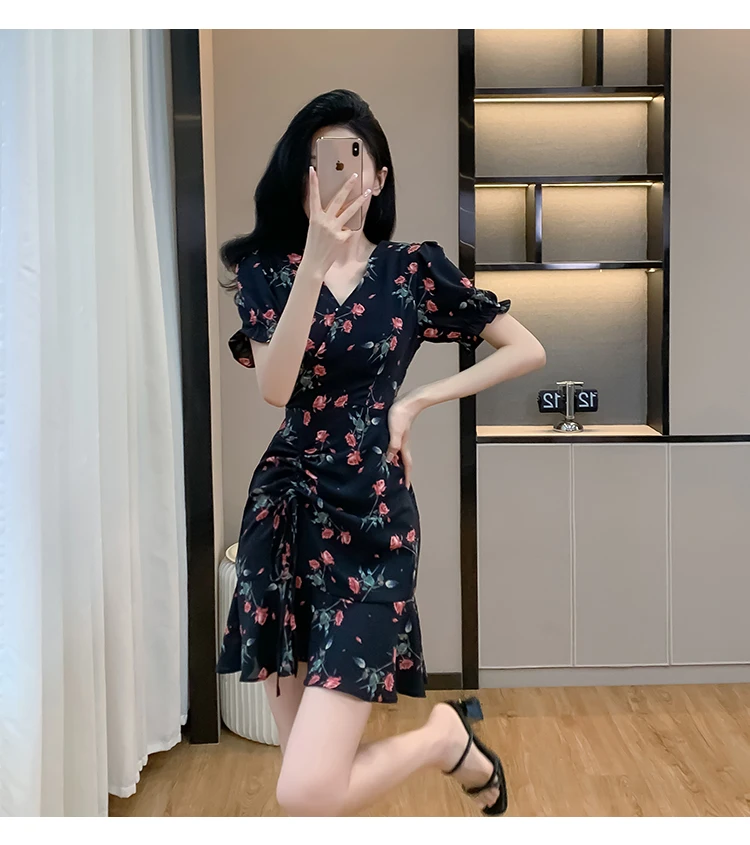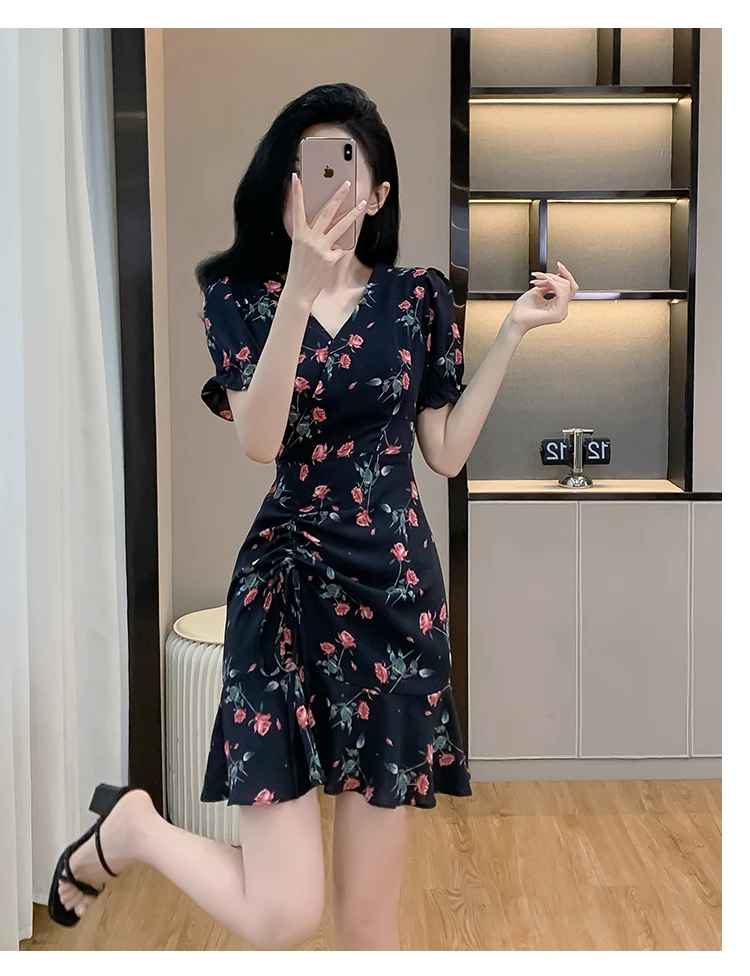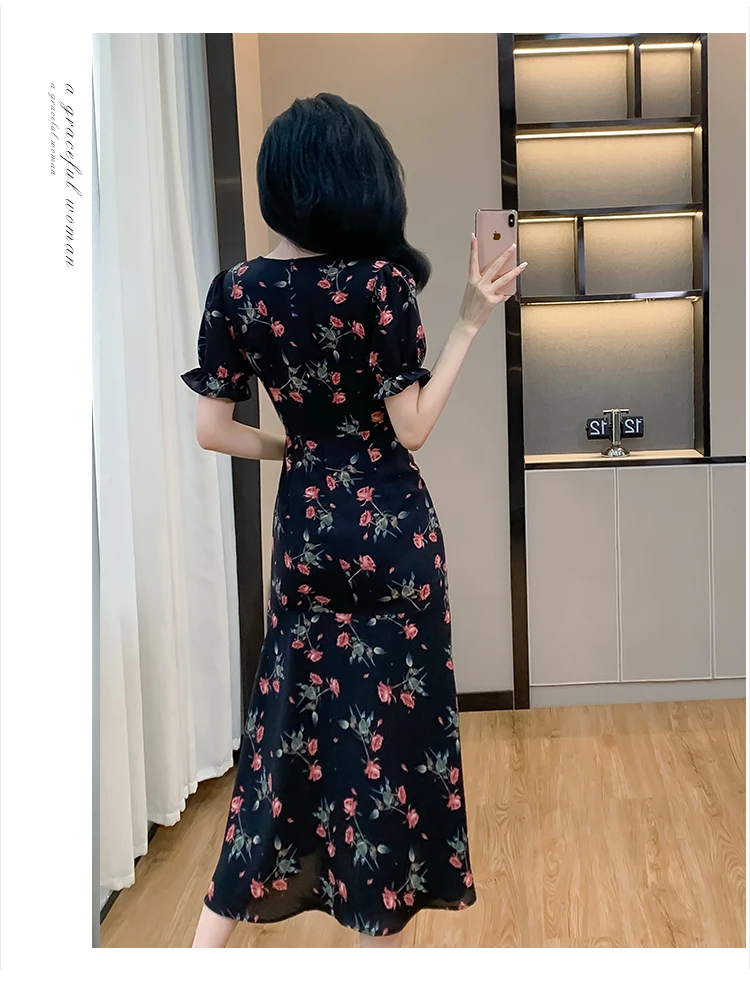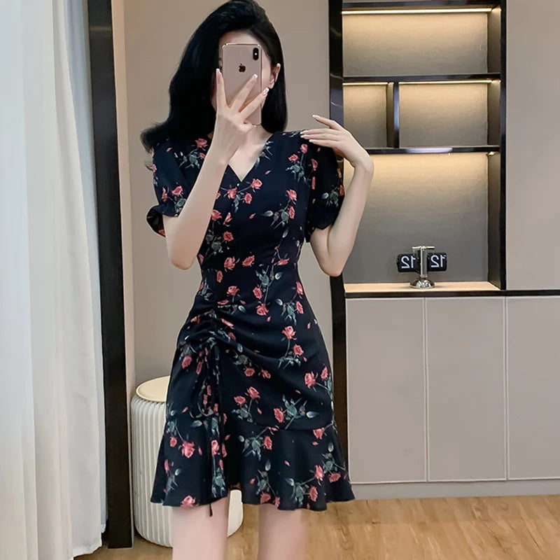 QAJAREL New Arrival High Quality Women Elegant Long One-piece Dress Gown Summer Black Floral Puff Sleeve V-Neck Luxury Dress Korean Bodycon Festival Dresses