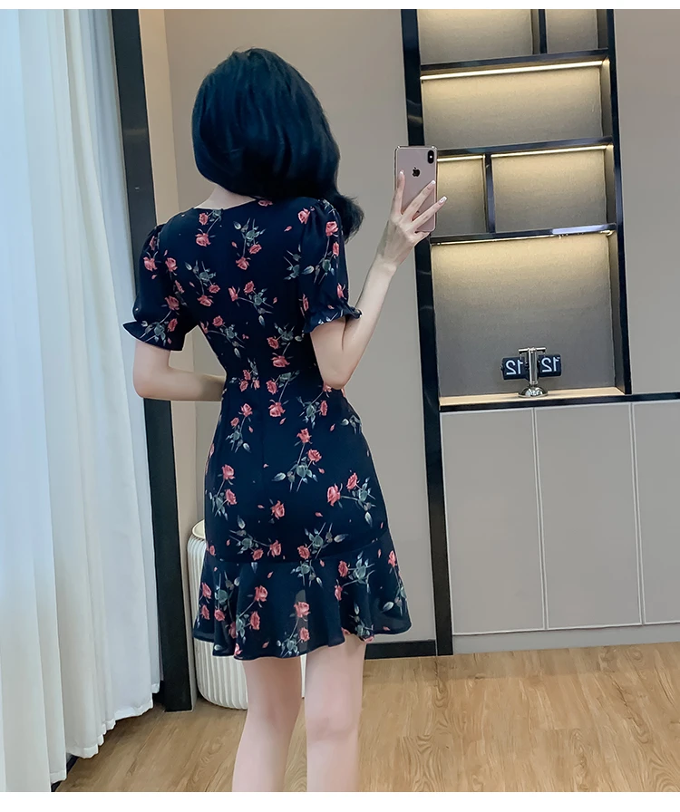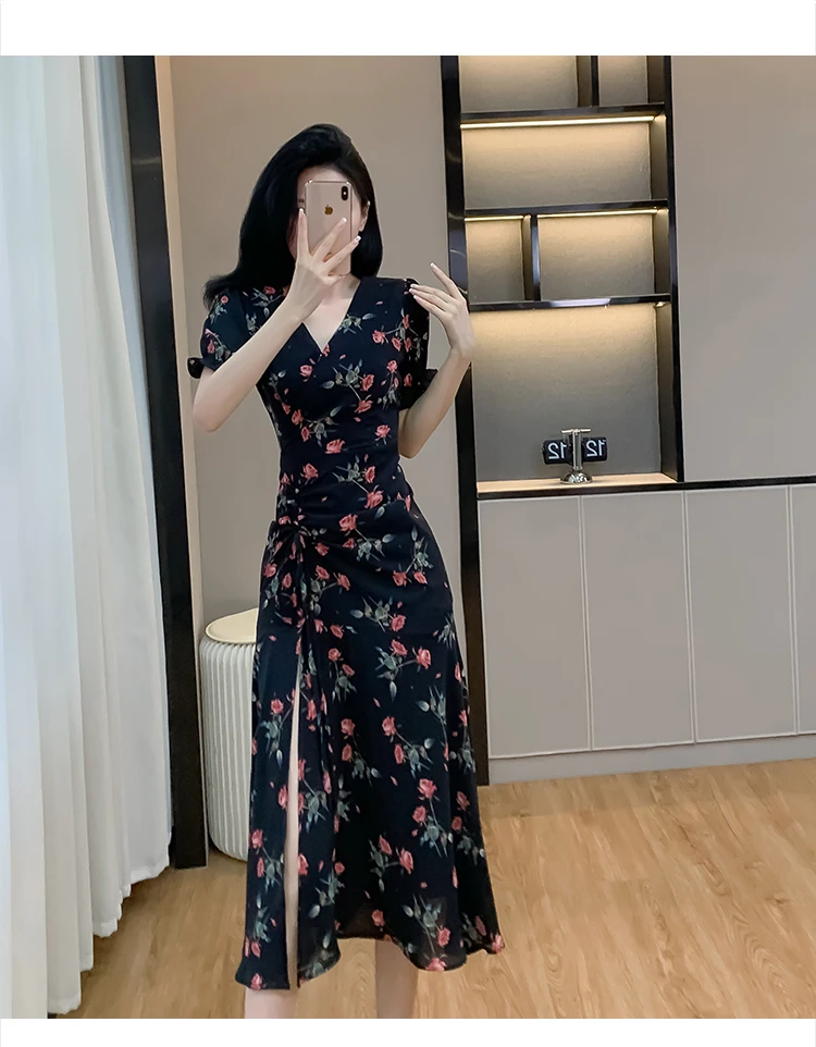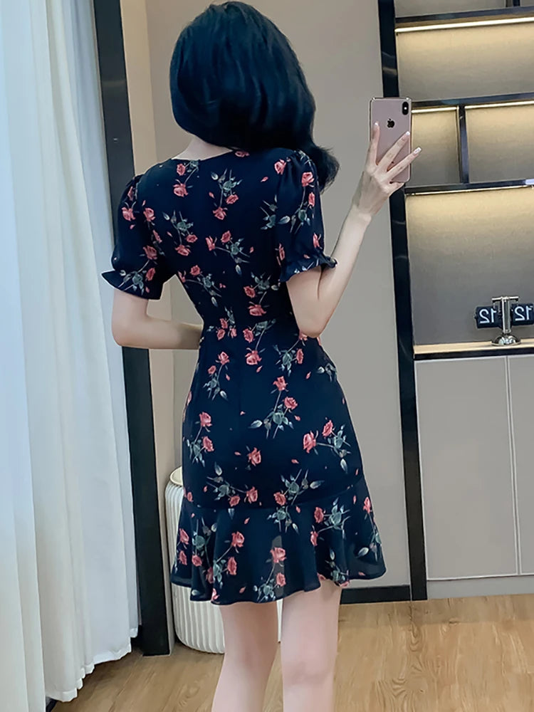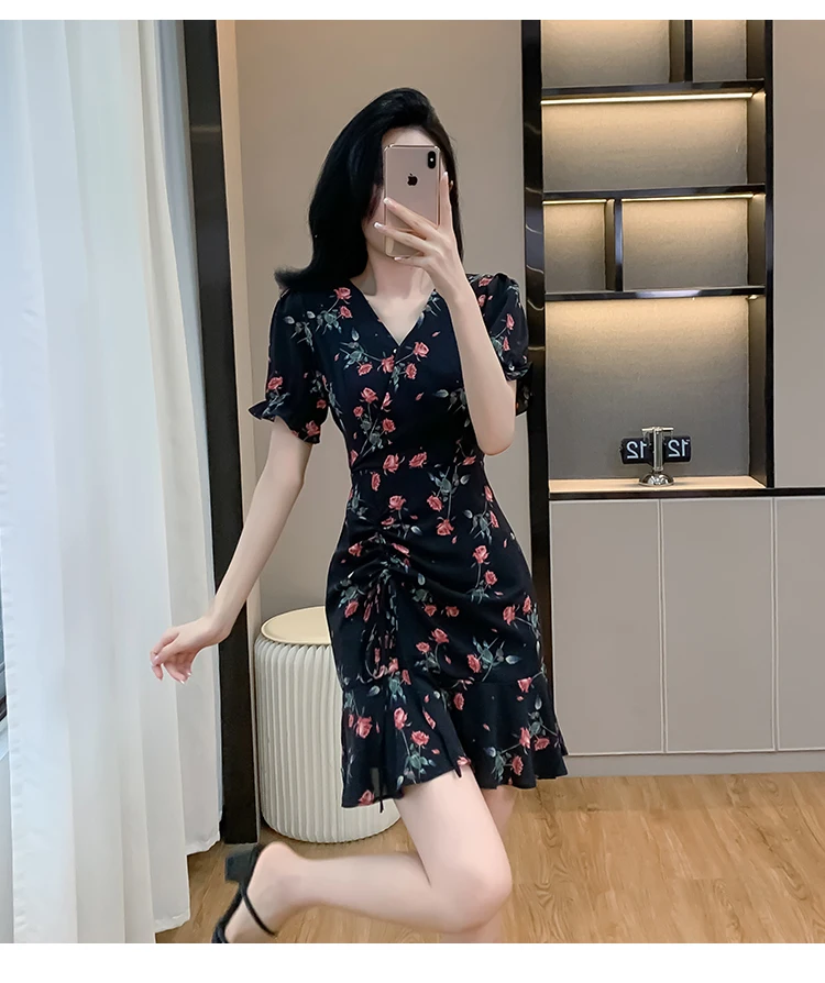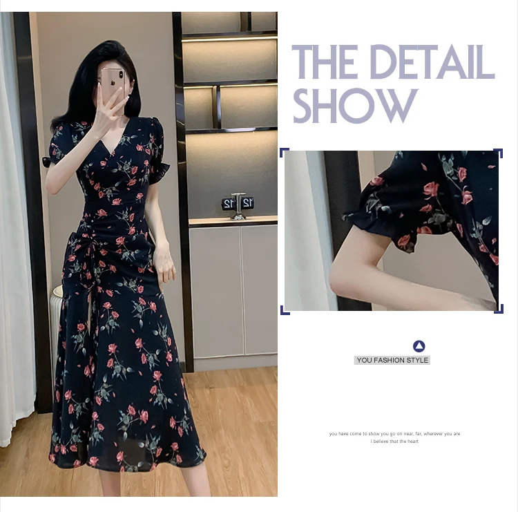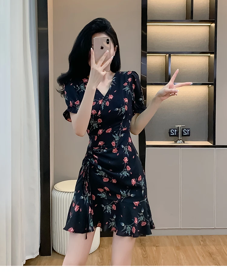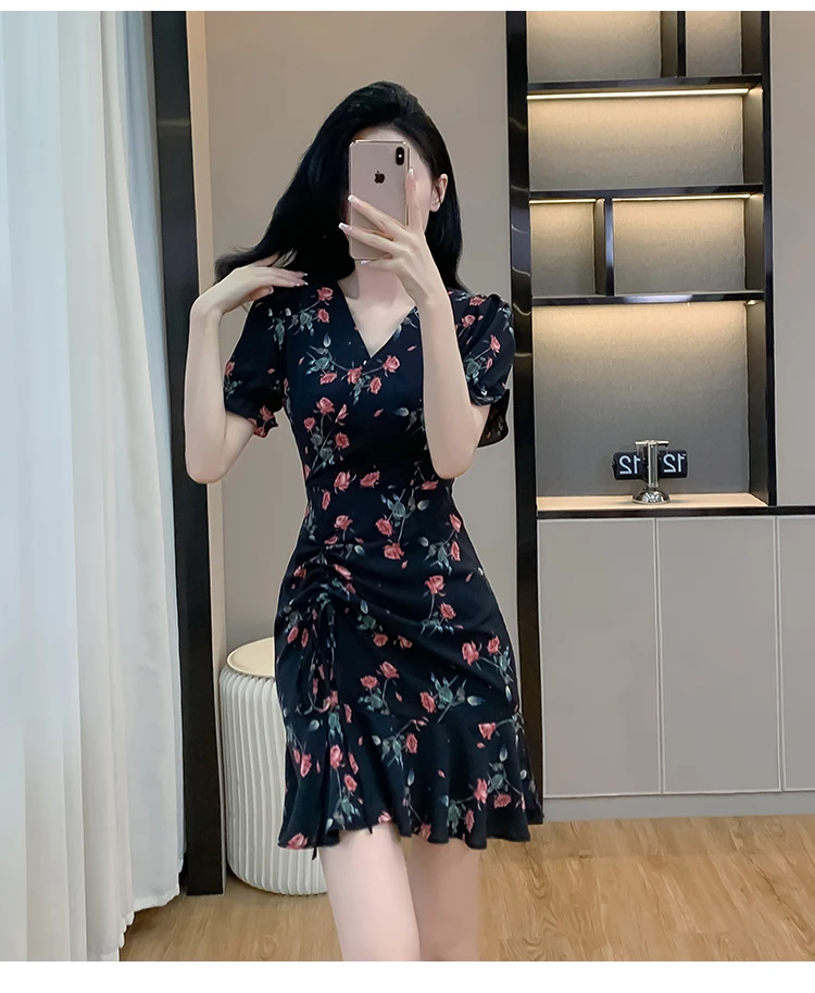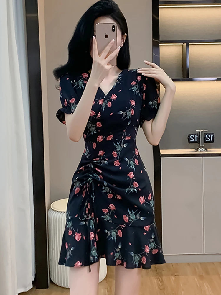 QAJAREL New Arrival High Quality Women Elegant Long One-piece Dress Gown Summer Black Floral Puff Sleeve V-Neck Luxury Dress Korean Bodycon Festival Dresses