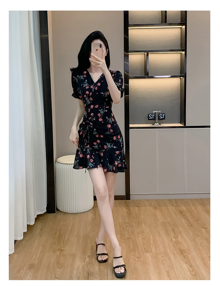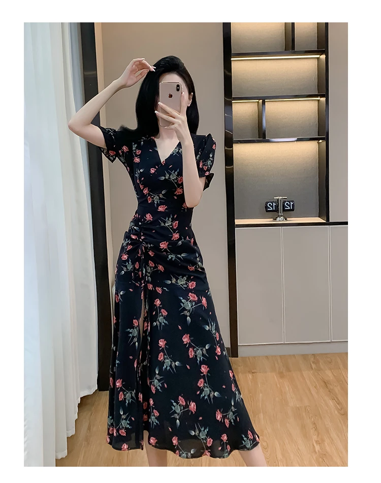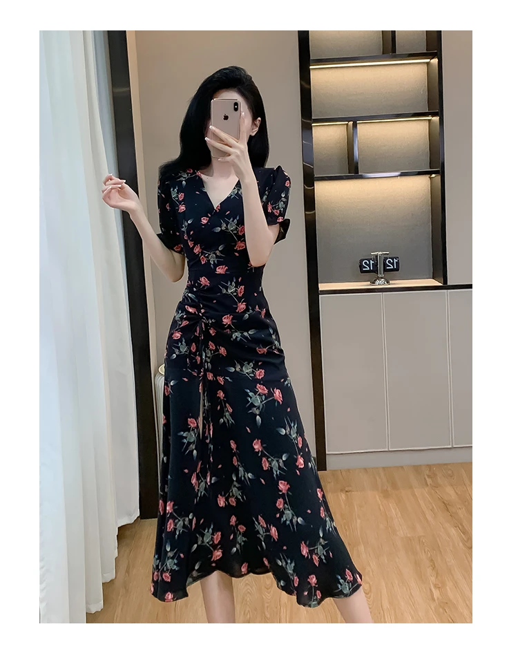 Lunivop Women Elegant Long One-piece Dress Gown Summer Black Floral Puff Sleeve V-Neck Luxury Dress Korean Bodycon Festival Dresses
