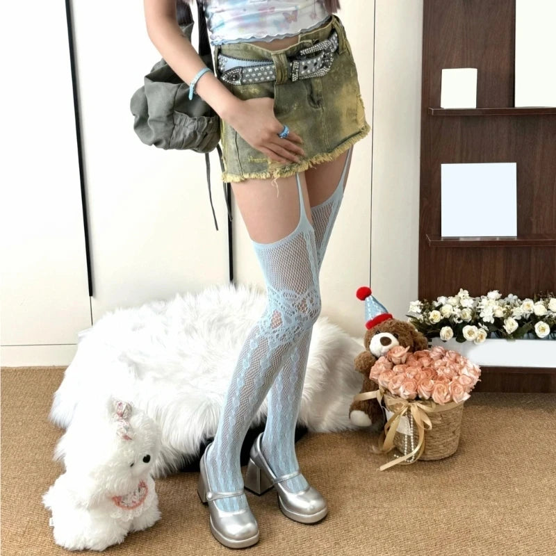 Lunivop Women Hollowed Fishnet Garter Belt Pantyhose Spicy Girl Sexy open crotch Punk Heart Patterned Sheer Thigh High Suspender Tights#