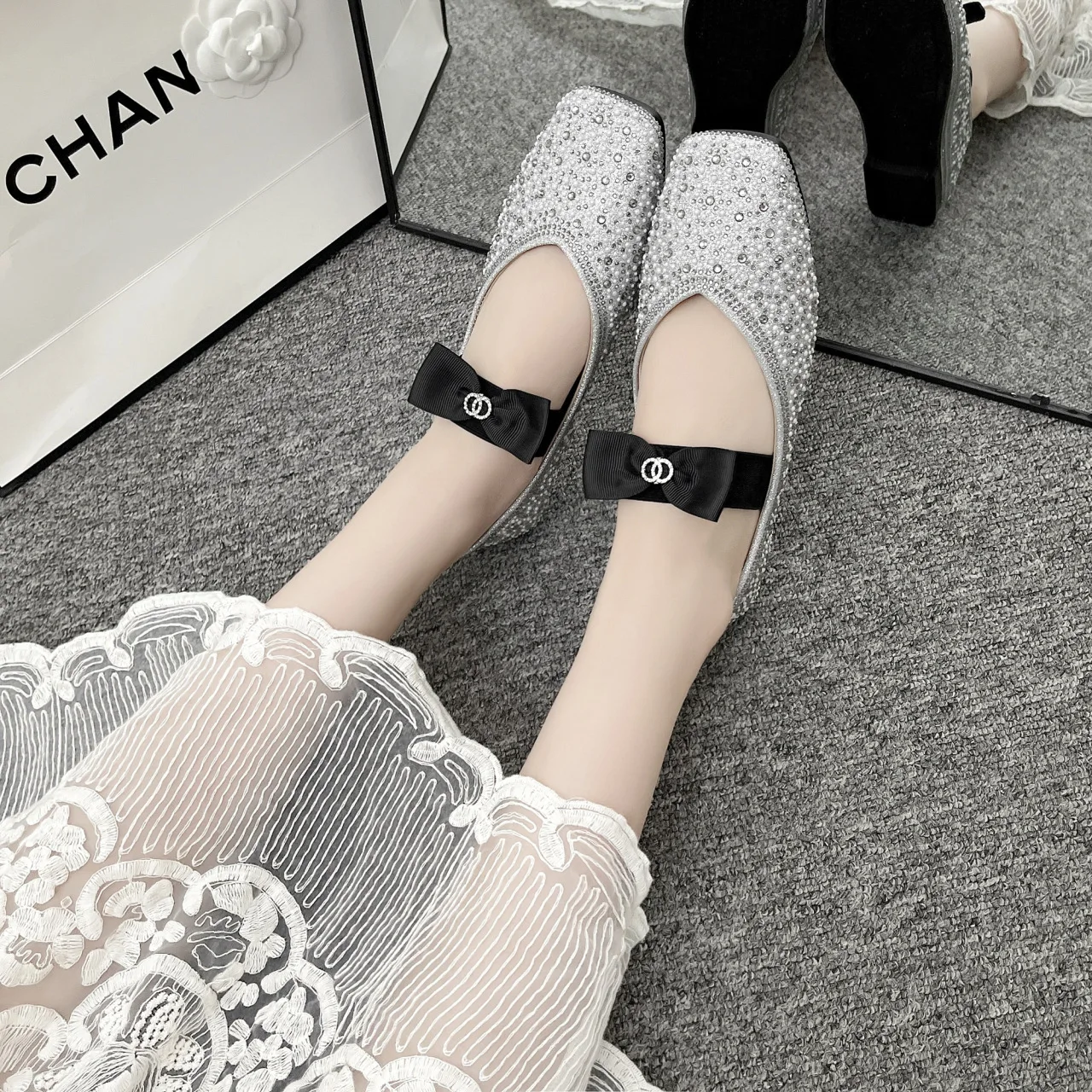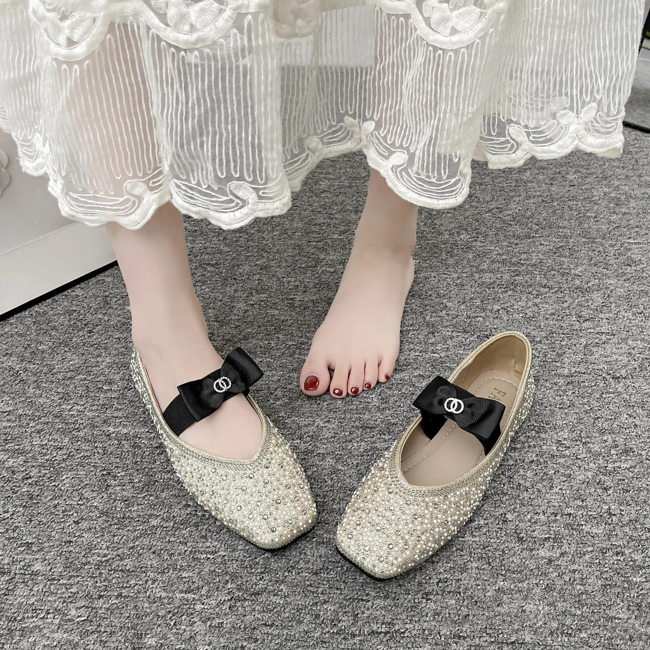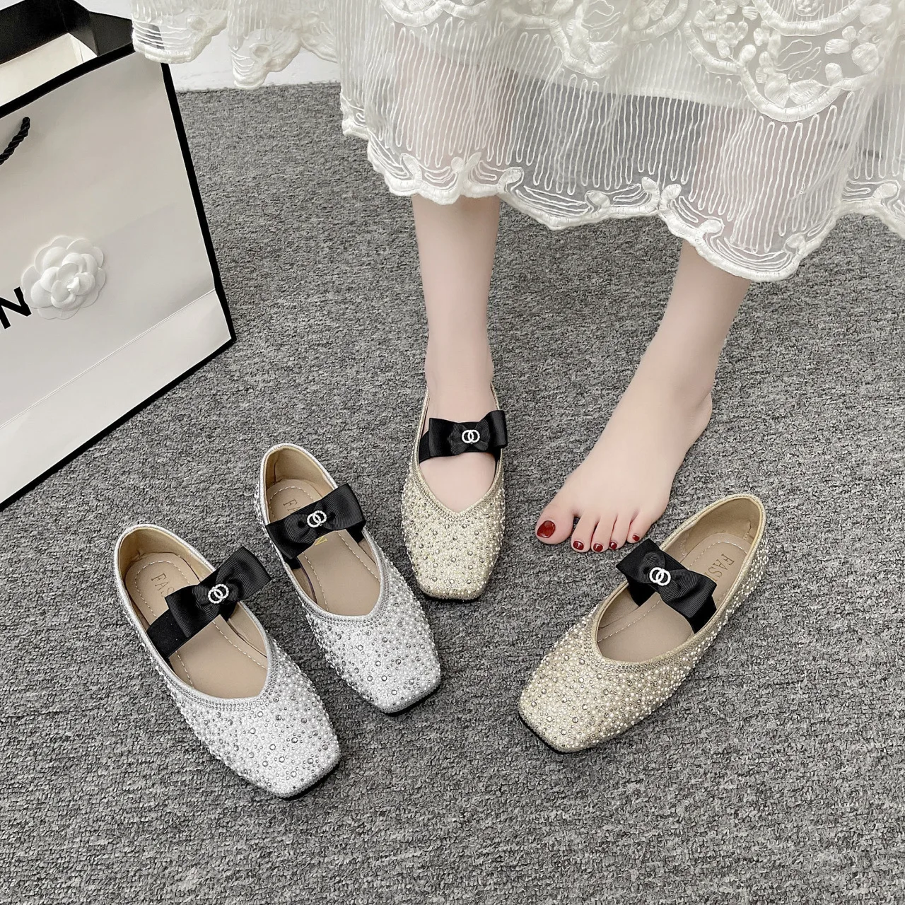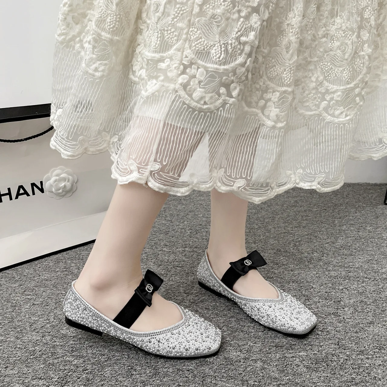 Lunivop Women Mary Jane Shoes New Fashion Shiny Rhinestone Women Flats Ladies Bowknot Square Toe Ballet Shoes Zapatos De Mujer