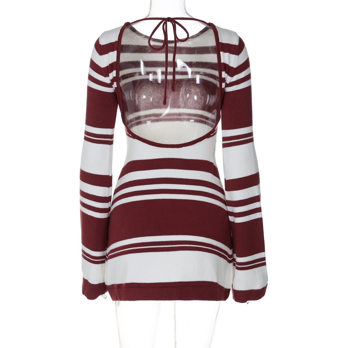 Lunivop Women Sexy Outfit Striped Pattern Crochet Elegant Bodycon Knitted Sweater Dress Open Back Flare Sleeve Streetwear